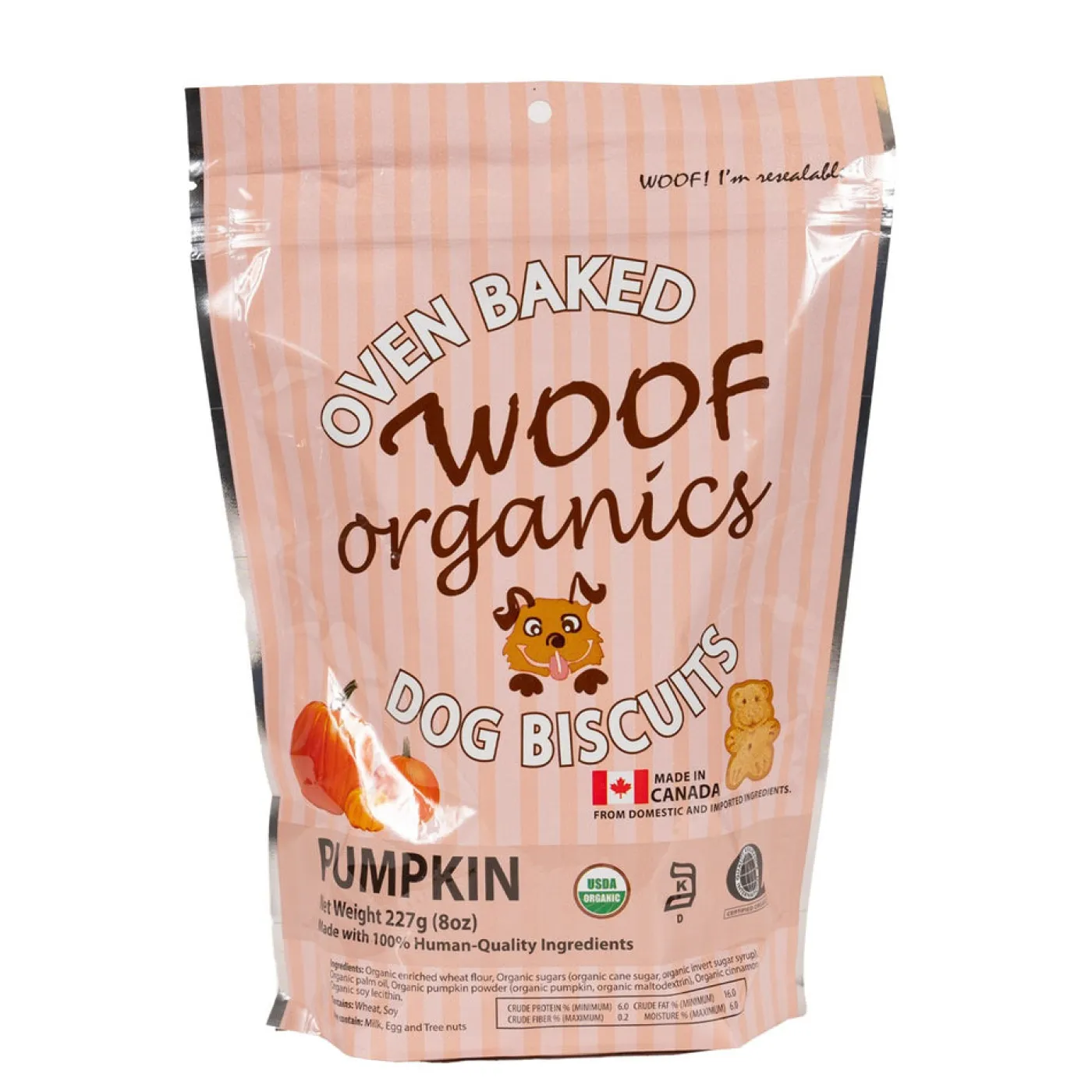 Woof Organics Dog Biscuits offer the perfect reward for your canine friend. Oven baked and proudly made in Canada. Free from artificial dyes, flavours, and preservatives. Made with only organic ingredients including pumpkin.