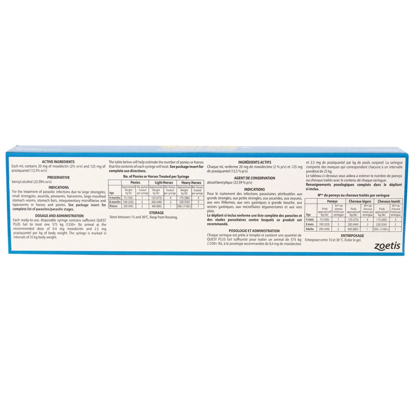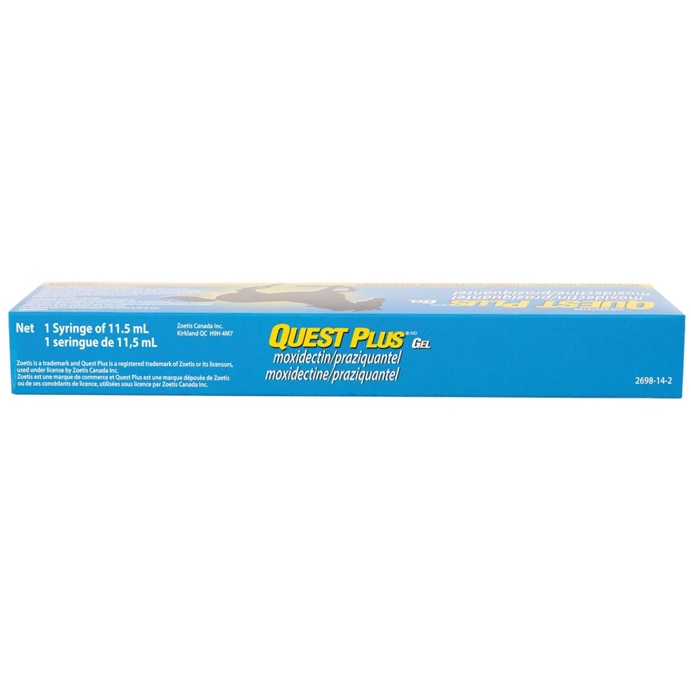 Quest Plus Gel is an effective horse dewormer that provides broad-spectrum treatment for large strongyles (bloodworms), bots, pinworms, hairworms and stomach worms. One syringe treats horses weighing up to 680 kg, and the unique gel formula dissolves on the horse’s tongue, making deworming easy!