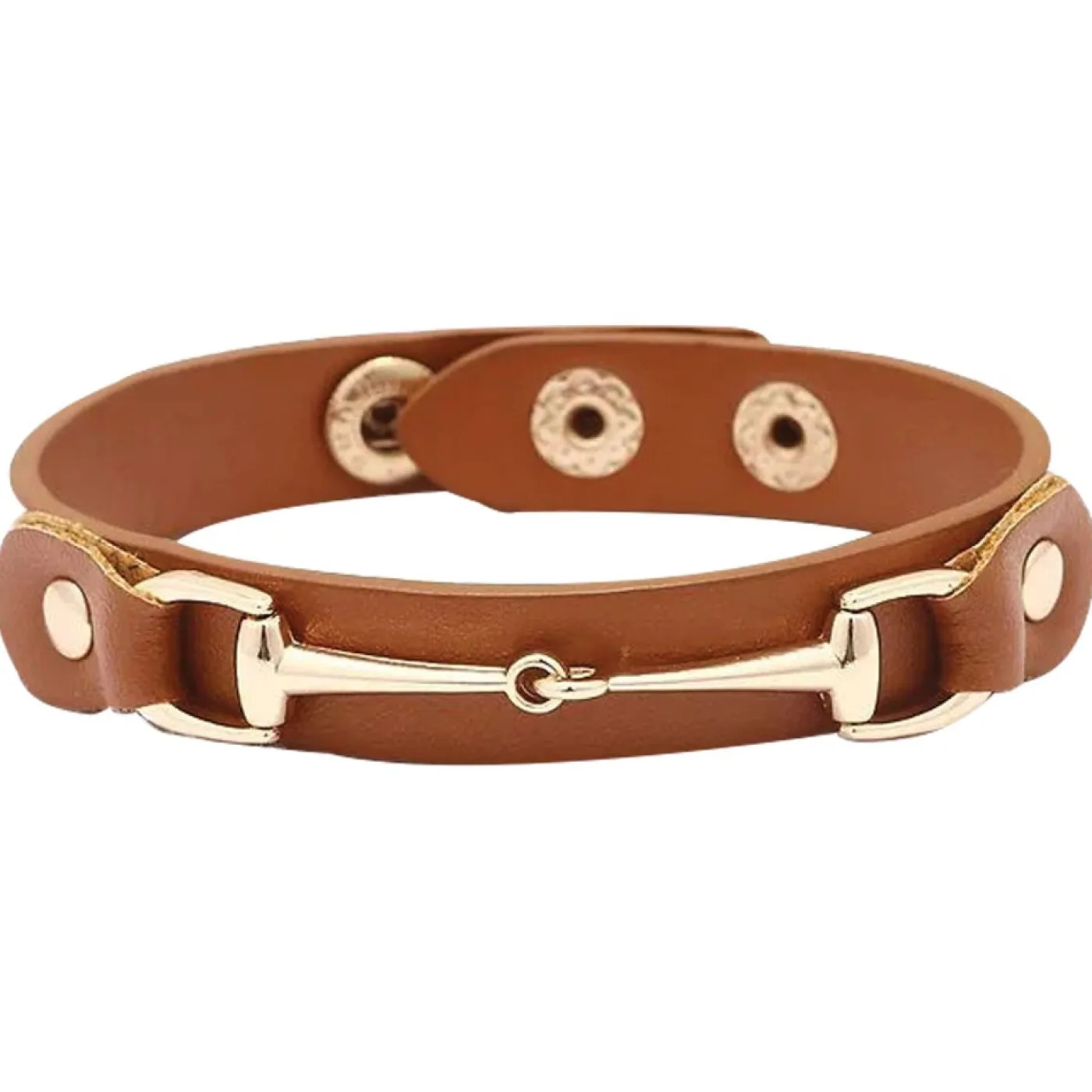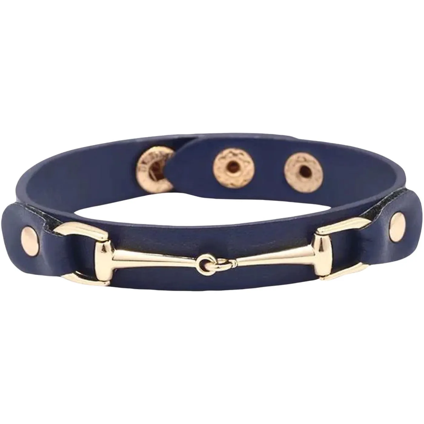 Add a touch of equestrian flair to any outfit with the AWST Vegan Leather Snaffle Bit Bracelet. This cuff-style bracelet features an eye-catching gold snaffle bit detail on a 1/2″W faux leather backing. Made from animal-friendly vegan leather. Two snap closures for an adjustable fit.