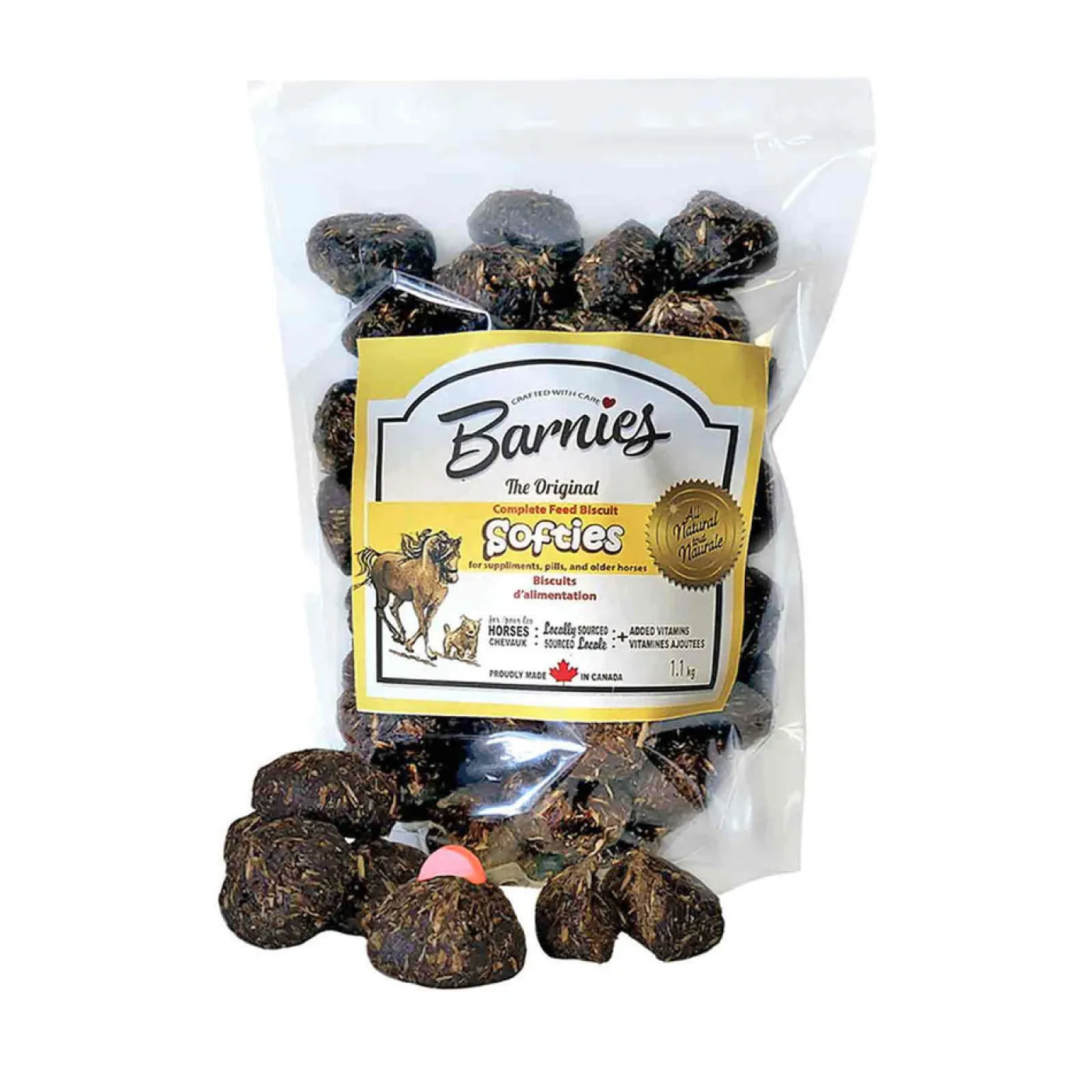 Soft, fresh, and all-natural snacks sweetened with molasses and crafted with care. These Softies are perfect for mixing with supplements, helping to administer pill medications, and are especially suited for older horses. As a proudly Canadian company, Barnies focuses on creating and distributing premium, all-natural horse treats. They take pride in delivering high-quality products that horses and ponies love. With Barnies, you can confidently give your equine companions the best, ensuring they enjoy every special moment.