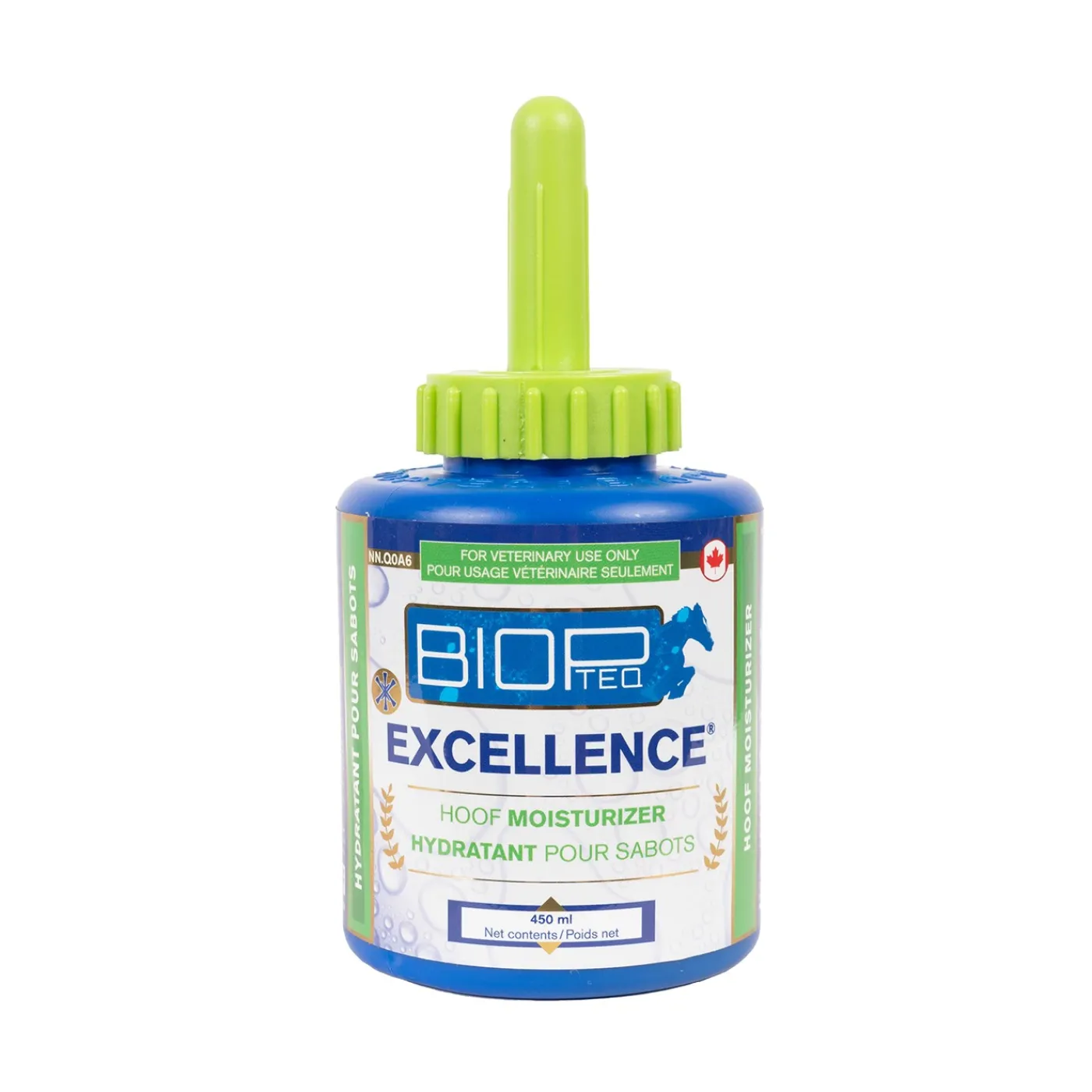 Biopteq Hoof Solution is a 100% natural formula, artisan-made for 12 years from vegetable oils and fresh laurel leaves that are macerated to release their active substances. Penetrating the hoof quickly, it helps nourish and soften the entire hoof without clogging the pores, helping the hoof breathe naturally! Regular use helps keep the hoof wall from drying out while shielding from dampness and helps encourage horn growth. 450 mL.