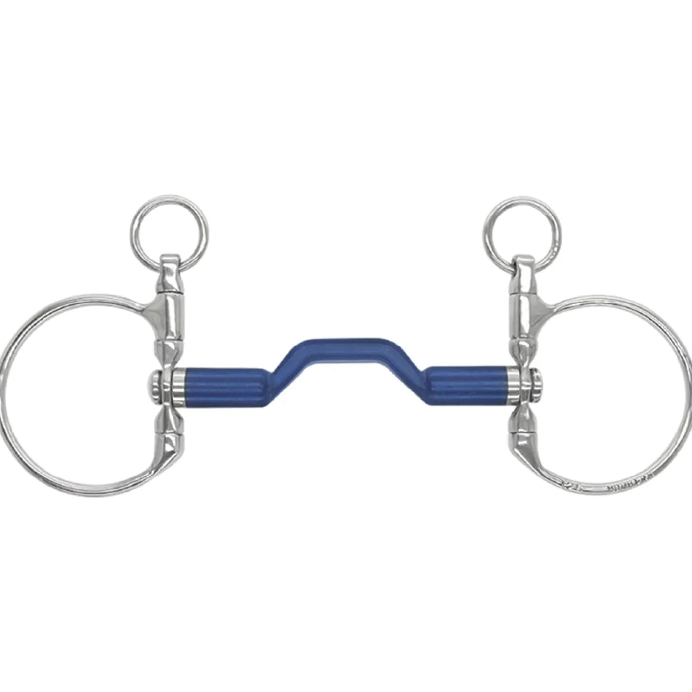 Great for horses that may object to metal mouthpieces! The Bomber Blue is a unique bit that helps horses perform at their best with a ported mouthpiece for tongue relief. The swivel mouthpiece can rotate on the horizontal, allowing the cheek piece to move independently so the horse can set the mouthpiece where it’s most comfortable. The reins attach to the large dee which swings independently of the cheek pieces ensuring the poll and cheek area is relieved from any rein engagement. The blue sweet iron mouthpiece oxidizes easily, warms up quickly, and tastes sweet in the horse’s mouth. Please note that the blue will fade and oxidize with use.