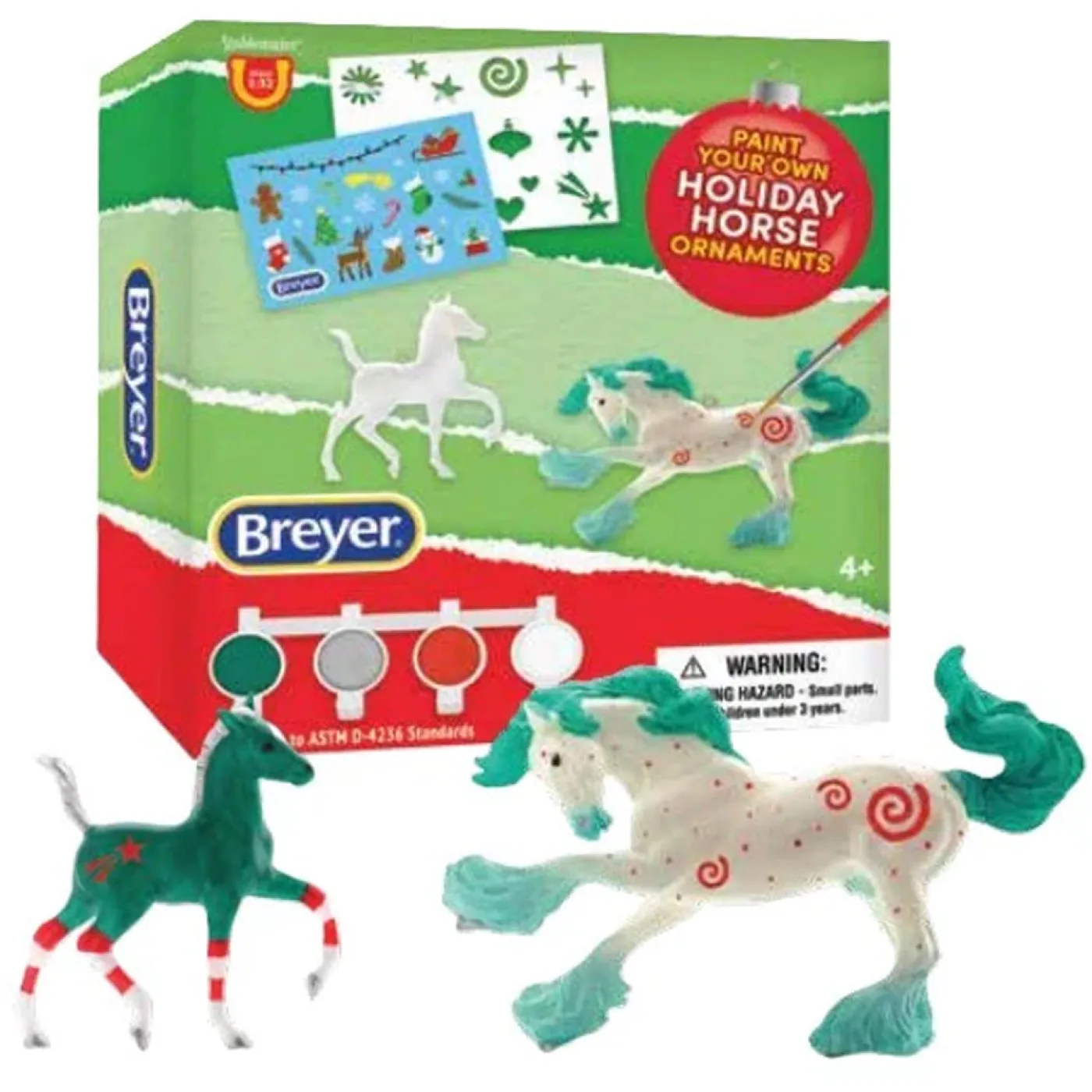 Features a feathered and frolicking stallion and foal ready to be transformed by your creativity into beautiful ornaments – with their hanging hardware already in place! Kit includes white, metallic silver, red and green paints plus an assortment of holiday themed stickers and stencils to customize and decorate the ornaments. Also includes 2 horses and a paintbrush.