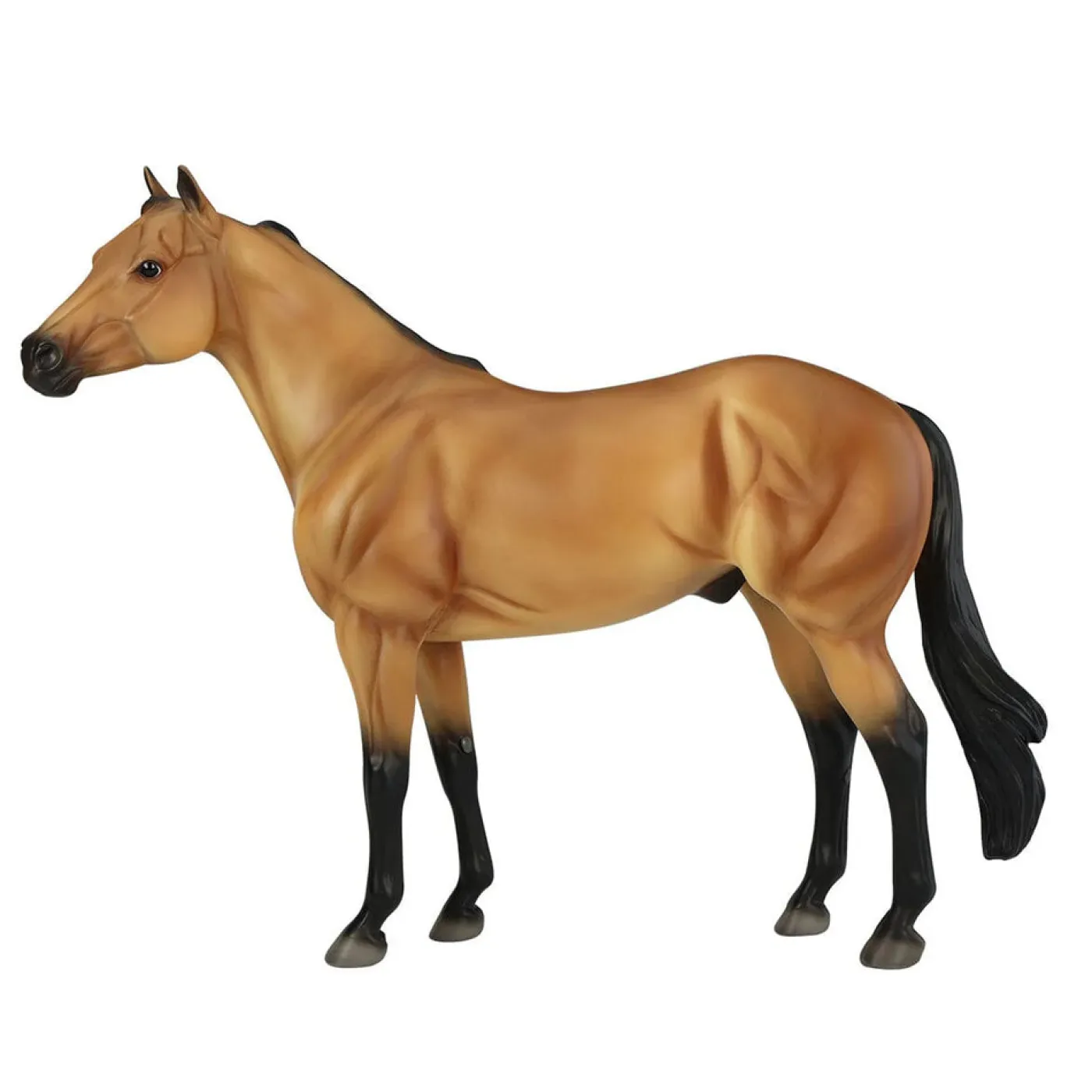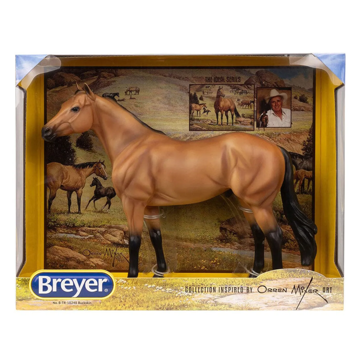 A buckskin is a bay horse with a cream gene that dilutes their hair to a rich caramel color with black or dark brown points. Buckskins can be found in numerous horse breeds and may vary from yellow to dark gold. Founded in 1971, the International Buckskin Horse Association is the world’s largest registry for horses of this color. “The Buckskin” by Orren Mixer was commissioned in 1996 and unveiled at the 1998 IBHA World Championship Show. The painting depicts a buckskin stallion with nine mares and nine foals, illustrating the various shades of the buckskin, dun, red dun, and grulla horses accepted for IBHA registration. The original painting is currently displayed at the AQHA Heritage Center and Museum in Amarillo, TX.