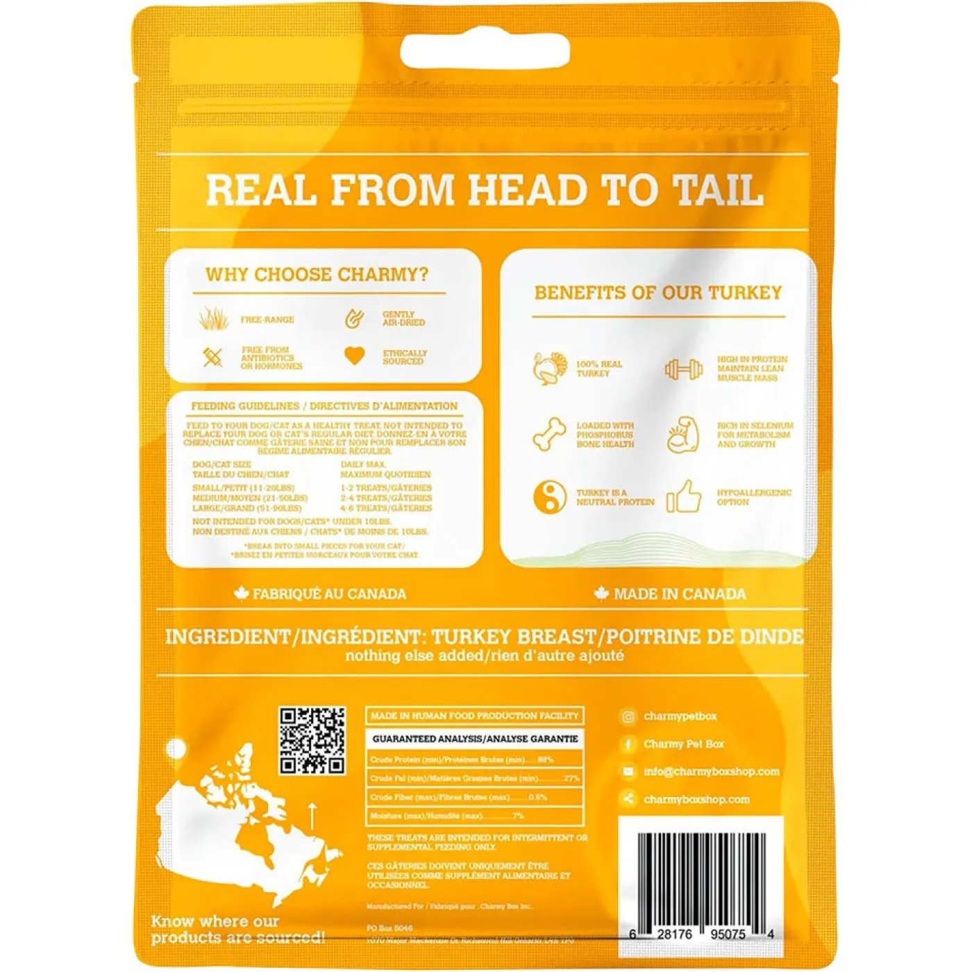 Charmy Turkey Breast Dog Treats are cut into square shapes and are simply air dried at a low temperature to retain maximum natural taste. Being low fat and high protein makes these pasture-raised turkey breast treats perfect for managing your dog’s weight. Feed during intense training sessions or as a healthy meal topper!