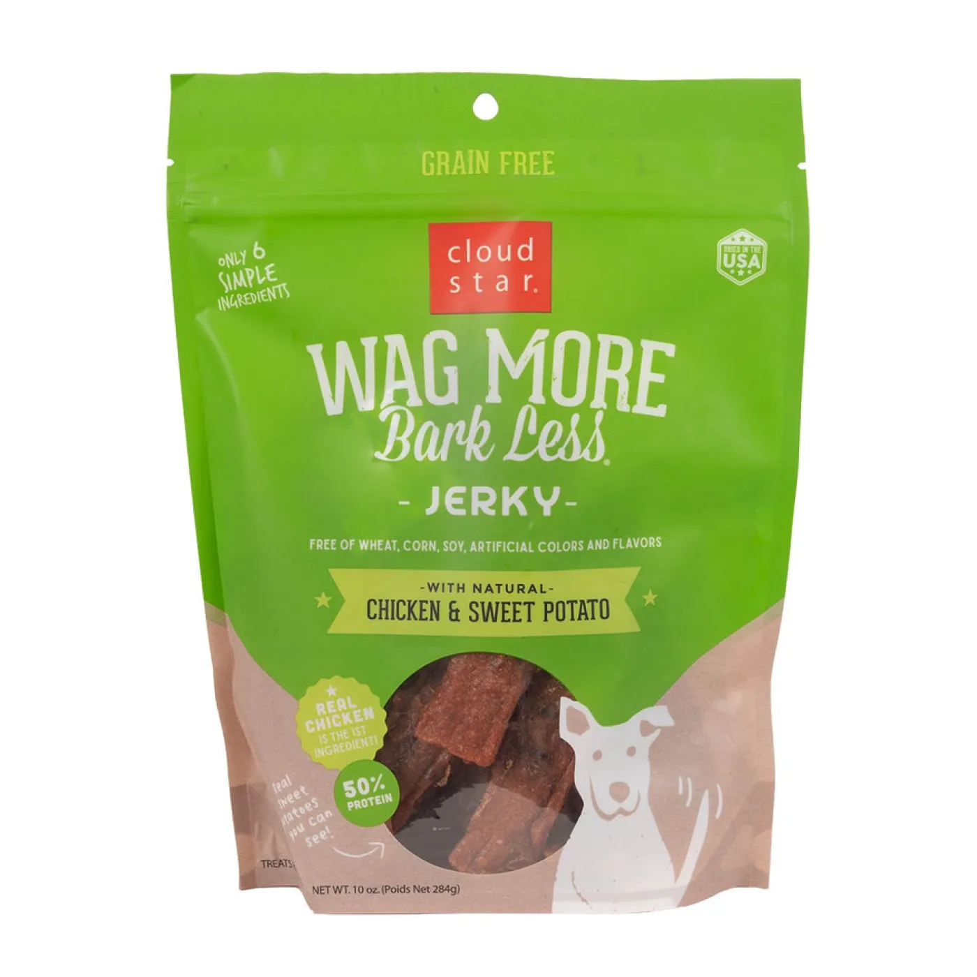 Cloud Star Wag More Bark Less Chicken Jerky is gently mixed and dried to perfection, offering a tasty treat that your pup will love. Made with chicken, sweet potatoes, vegetable glycerin, salt, chicken broth and vinegar. Grain and gluten free, and free of corn, wheat, soy, animal by-products, artificial colours and flavours.