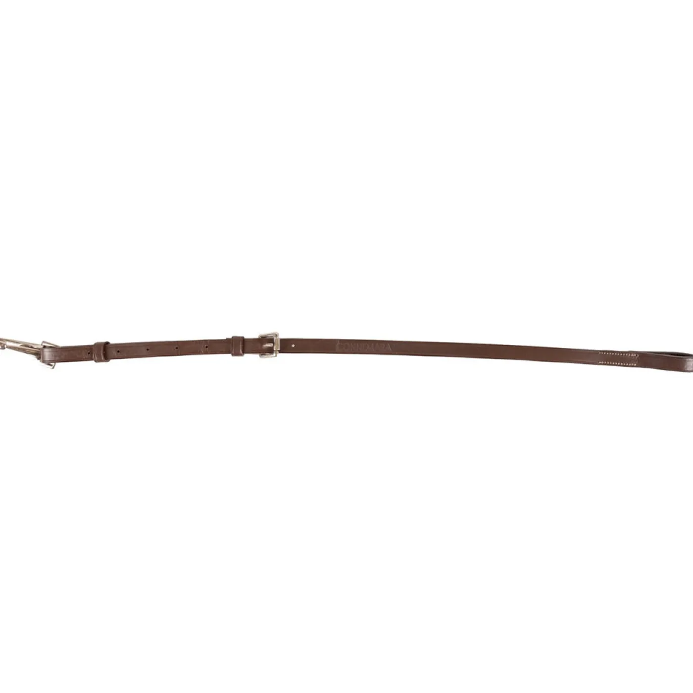 Adjustable flat leather standing martingale attachment. Design includes a snap on one end for easy attachment to the center ring of the breastplate and a loop on the other end to attach to the noseband on the bridle. Width ½ inch.