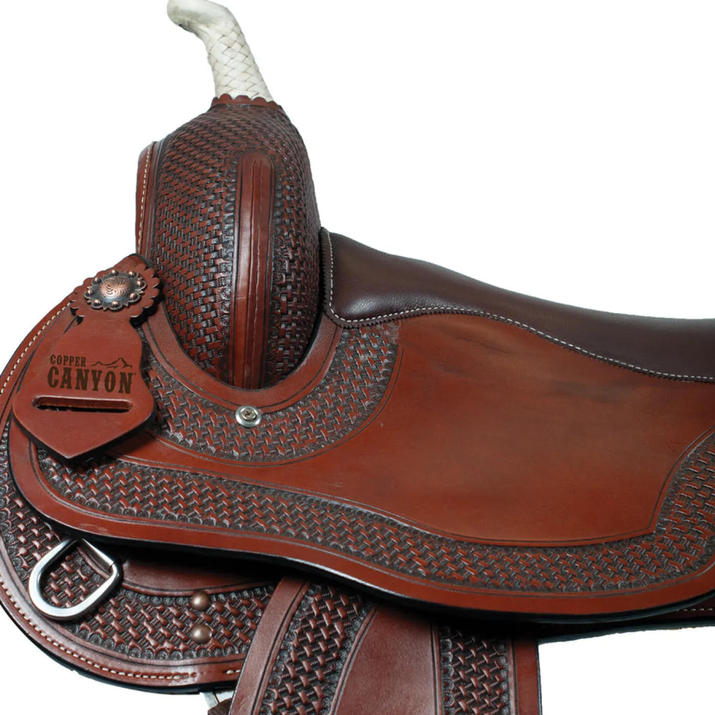 Exceptional all-around leather saddle, thoughtfully created for training, ranch work and designed to offer all day comfort to both horse and rider. Cut back and gently rounded skirt won’t impede hip movement of the horse and full QH bars offer a great fit on Quarter Horses and other broad backed types. Finished with copper berry conchos, wrapped rawhide horn, basket weave detailing and metal stirrups. Seat measures 16 in. L, skirt measures 27 in. L, channel measures 5 in. W. Weighs 25.5 lb. Due to the size of this item, an additional shipping fee applies.