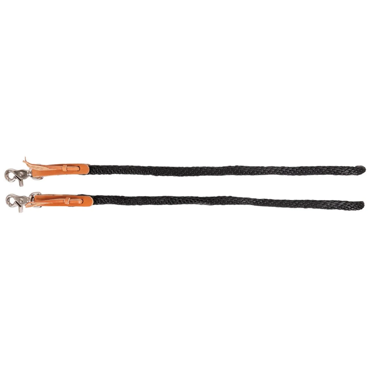 Crafted from quality 13 mm x 2.4 m braided poly rope that is soft in your hands, perfect for long days out on the trails. Nickel-plated scissor snaps with leather ties offer easy attachment to the bit and breakaway functionality.