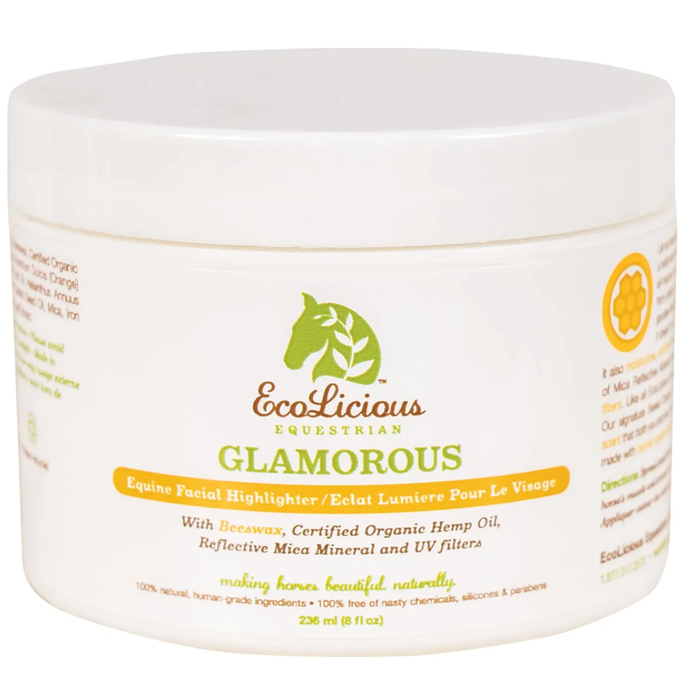 Glamorous Facial Highlighter offers that special finishing shine around the muzzle and eye area, and really turns up the drama on horses of all colors. It’s like visiting the makeup counter with your horse. Giving your horse that little extra touch of glamour before your turn in the show ring can make the difference in your score, not to mention you and your horse’s confidence level as you make your grand entrance. Glamorous uses the natural reflective power of Mica mineral to add shimmer with the added bonus of natural shield from harmful UV rays. Beeswax and certified Hemp Oil moisturize and soothe the skin and coat, while Sweet Orange Essential Oil makes it smell heavenly. Like all of EcoLicious Equestrian’s grooming products, ingredients are all natural and environmentally friendly and are human grade so are safe to use on people and animals. There are no toxic ingredients or silicones that give slick shine but are petroleum based. A touch of Glamorous on your shoulders, arms or gams will glam you up too. Packaged in 100% recycled plastic.