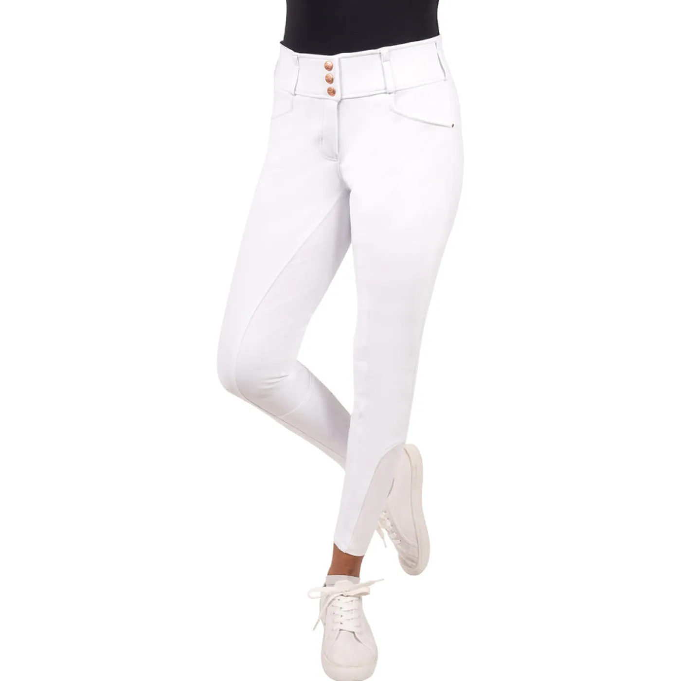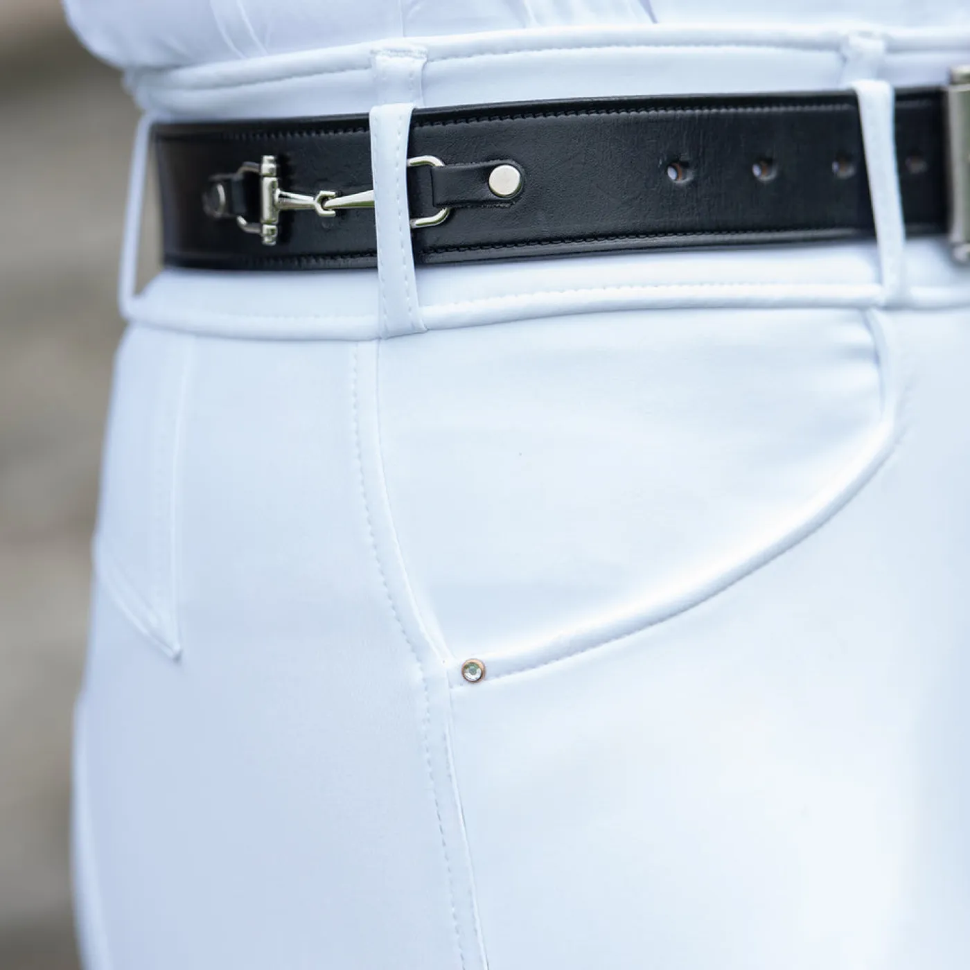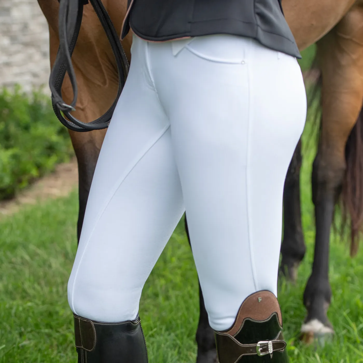 The Elation Diamond Gramercy Full Seat Show Breech offers a high waist band full seat style that is suitable for dressage riders. Features an elegant, 3 snap high rise waist with belt loops and a rose gold detailed centre loop. Constructed with two large slanted front pockets with subtle diamond studs at the corners, and rose gold snaps at the waist. Complete with a silicone full seat for added grip in the saddle with spandex socks for a smooth fit in your boots.