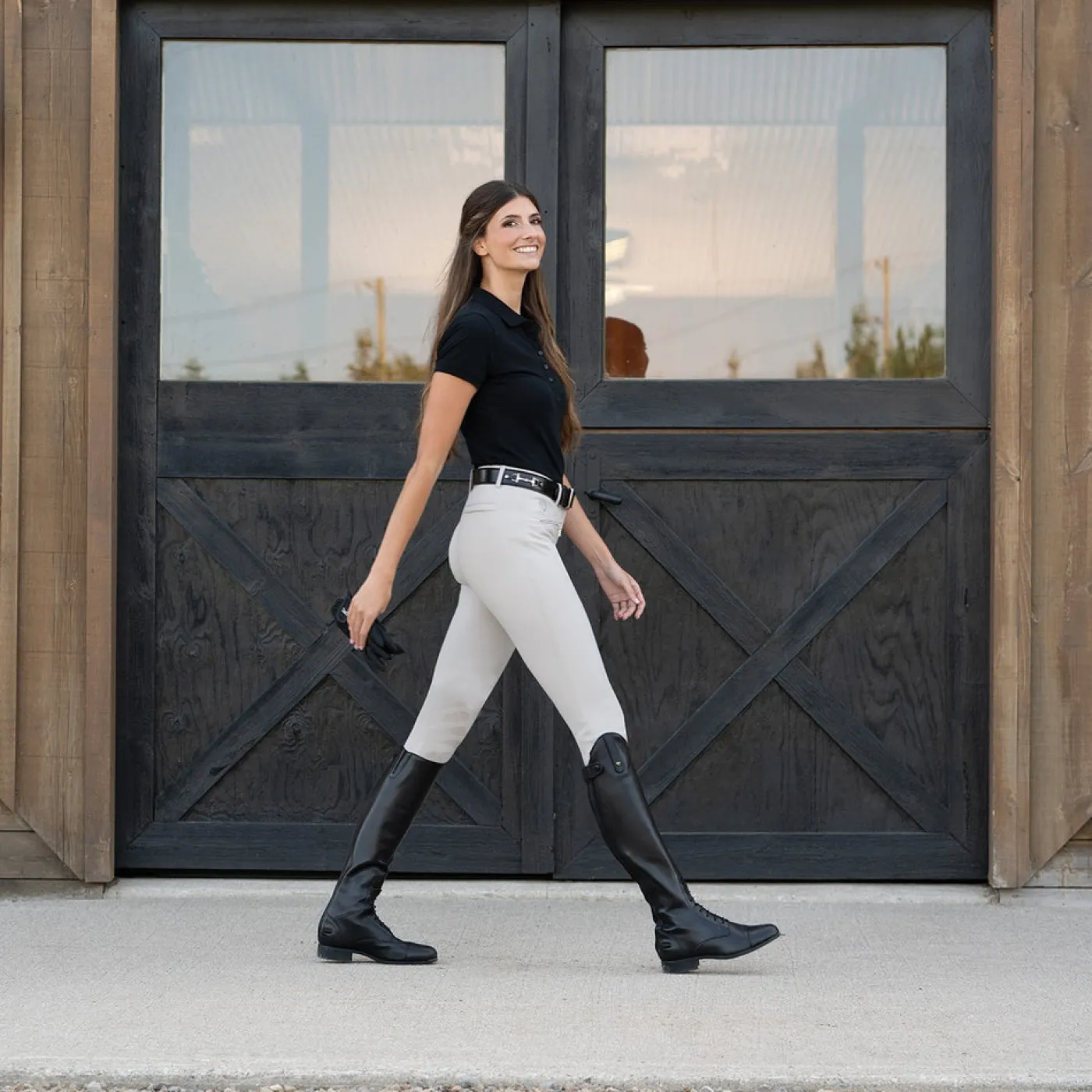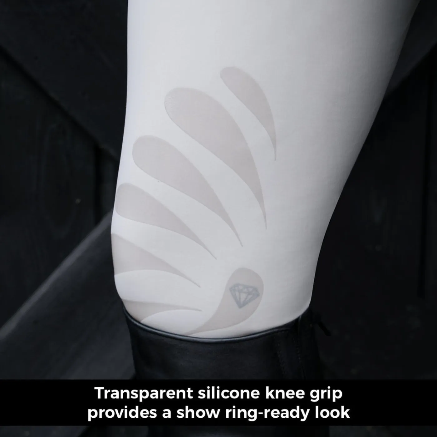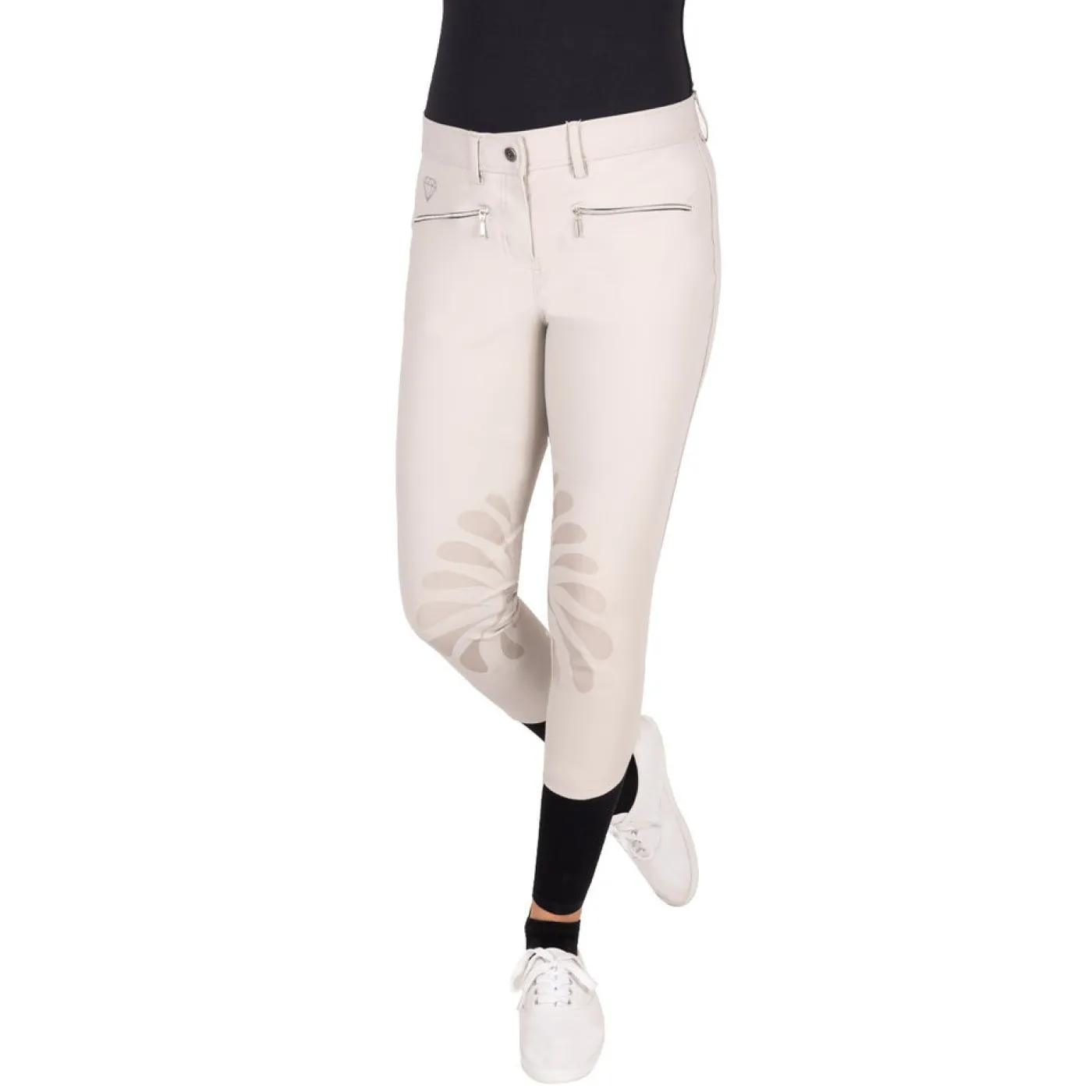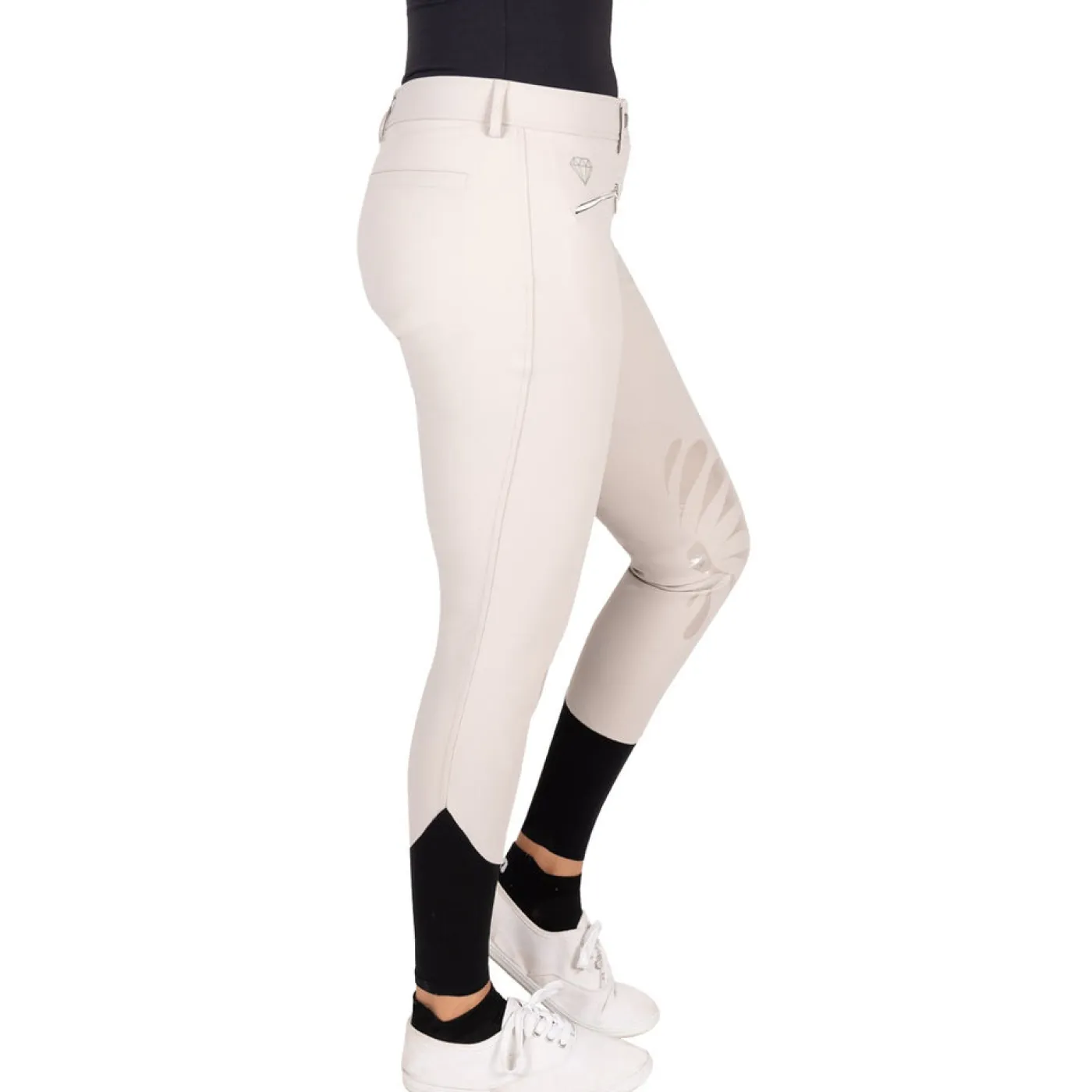 The Elation Diamond Kai Breech is offers comfort in or out of the show ring with a dust resistant, and smooth construction. Offering 4-way stretch for added comfort, and seamless stretch socks for reduced bulk under tall boots. Compete with a belt loops, silicone grip knee patches and 2 front zippered pockets.