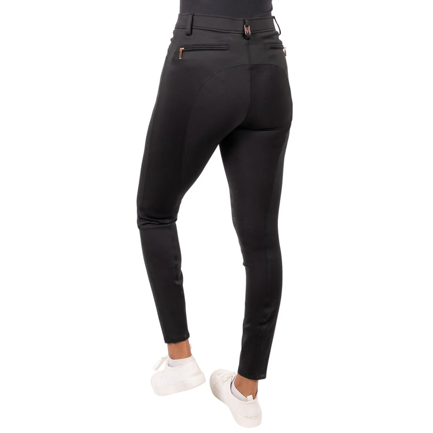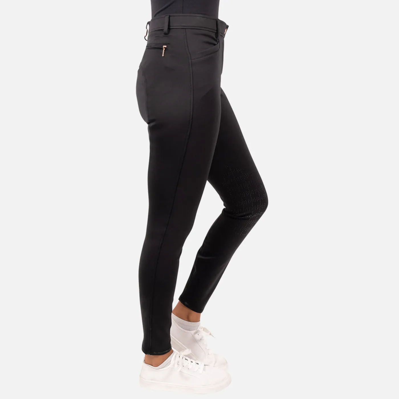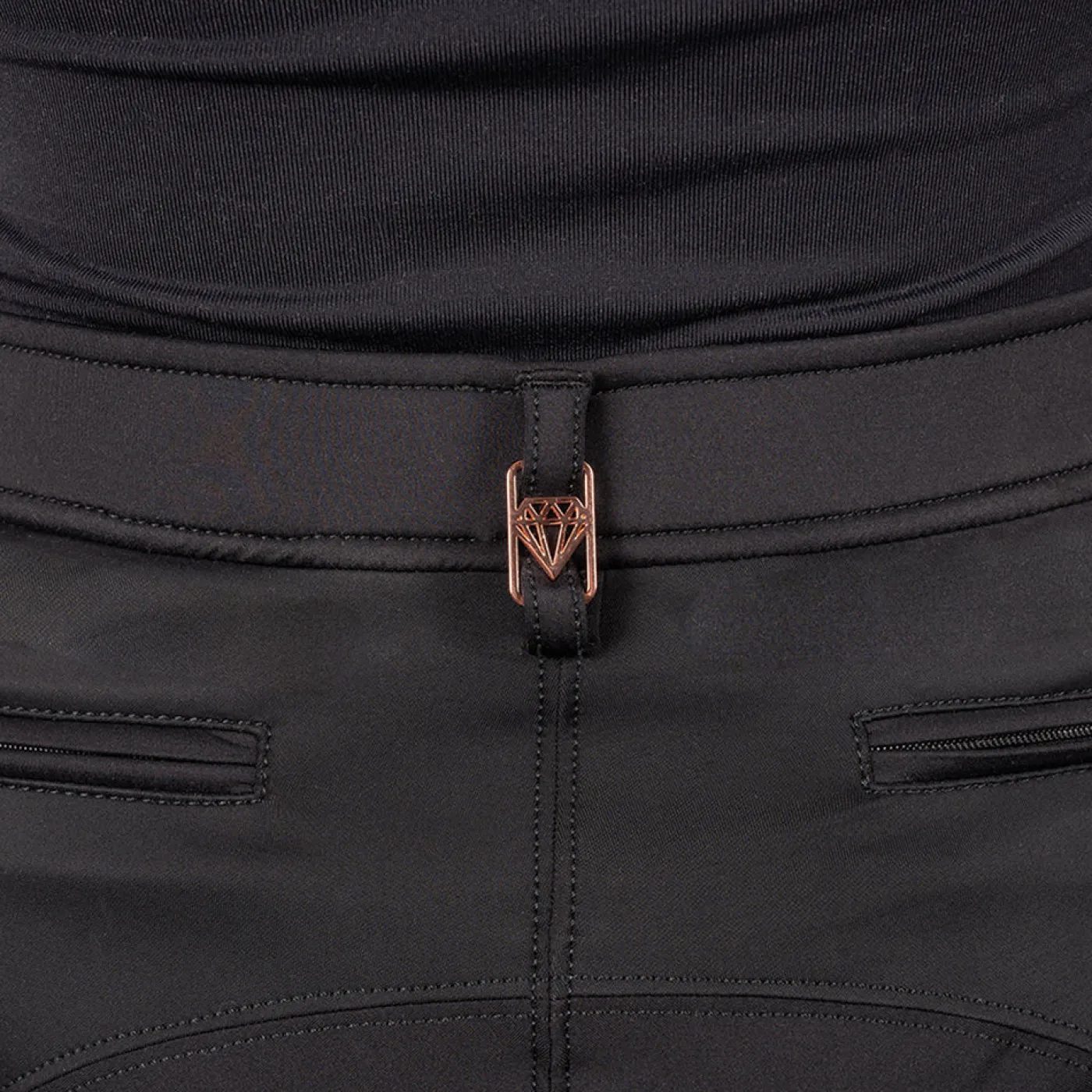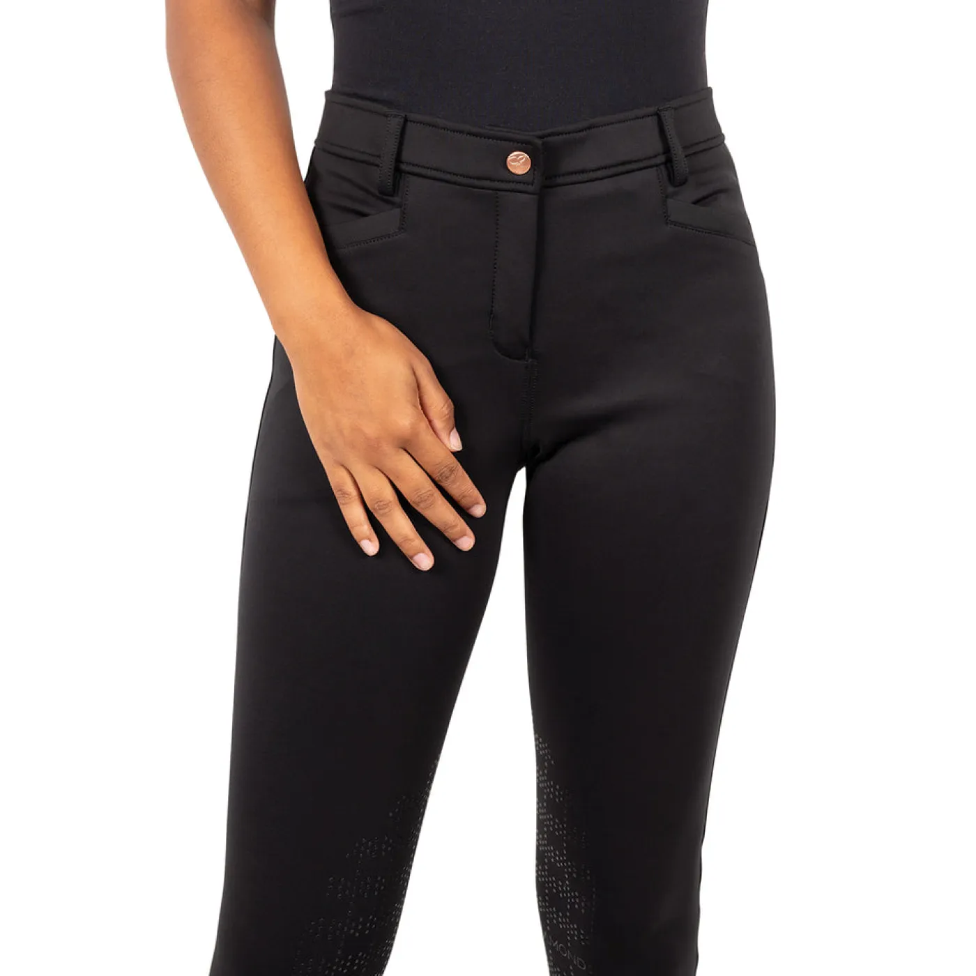 The Elation Diamond Sutton Breech is suitable for everyday wear or within the jumper ring. These silicone knee patch breeches are stretchy and comfortable for all day wear featuring flattering front pockets and zip detailed back pockets. Constructed with 4-way stretch fabric for unrestricted movement while supporting shape retention. The interior waistband is trimmed with silicone to prevent shirts from untucking. Complete with a belt loop slider and self-fabric legs.