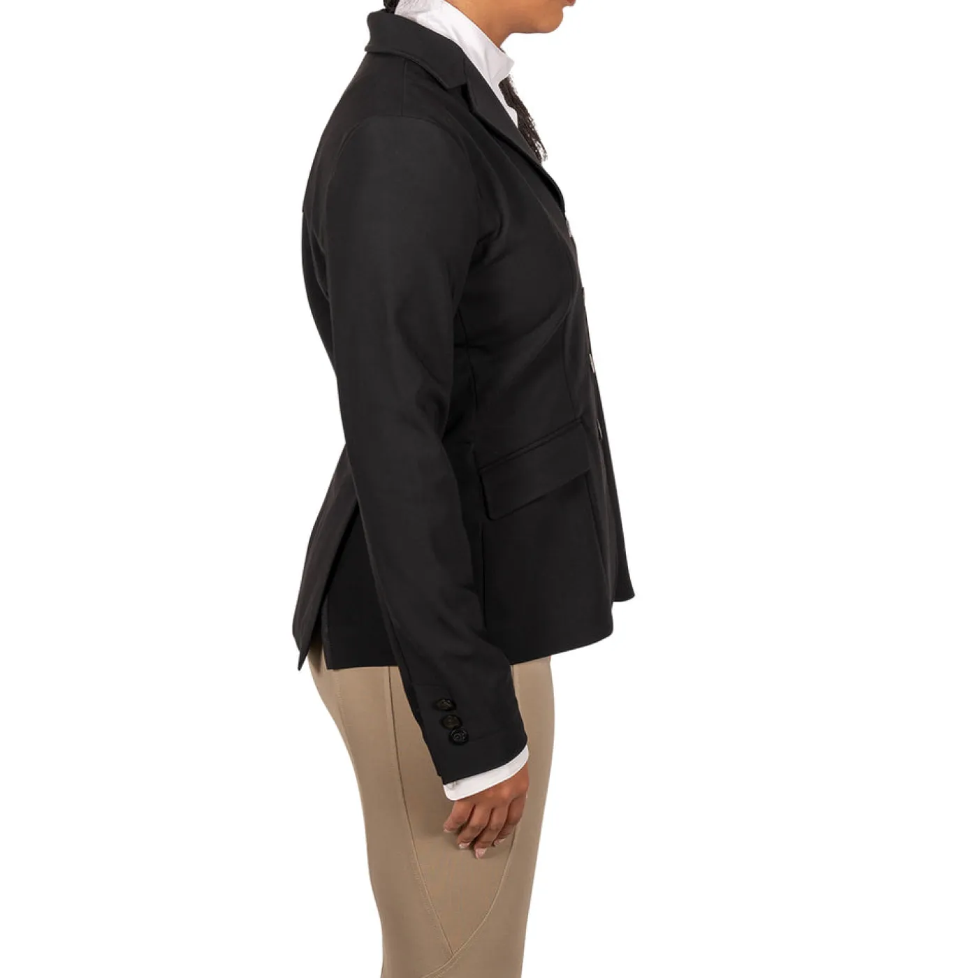 This women’s show jacket provides the look of a traditional long sleeve show shirt under the jacket with the addition of removeable cuffs. Offers 4-way stretch for all day comfort and flexibility, with a hidden zipper placed beneath the front buttons to help prevent gaping. Unlined with taped seams and is complete with small holes on the side seams at the waist for threading back number strings, keeping the knot out of sight.
