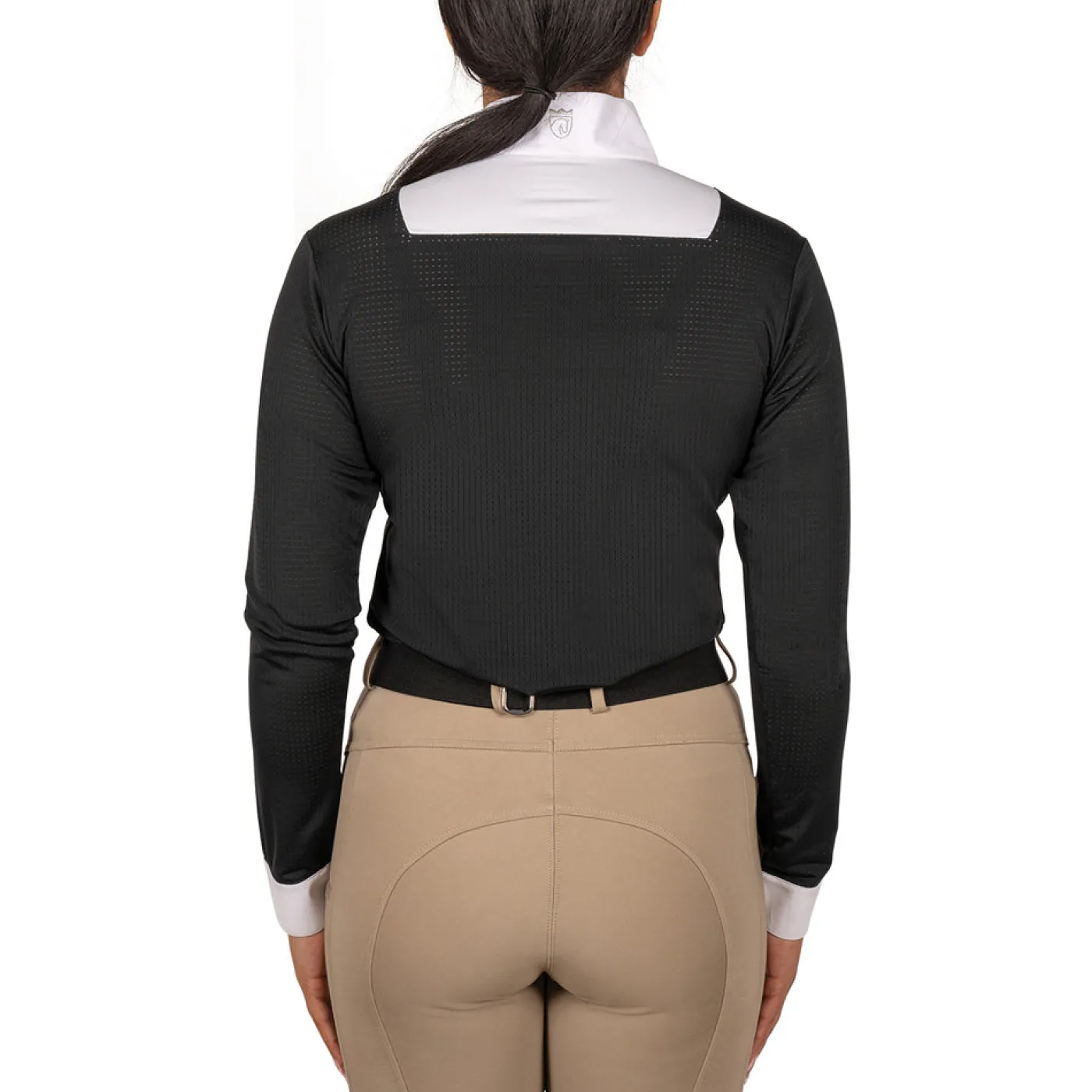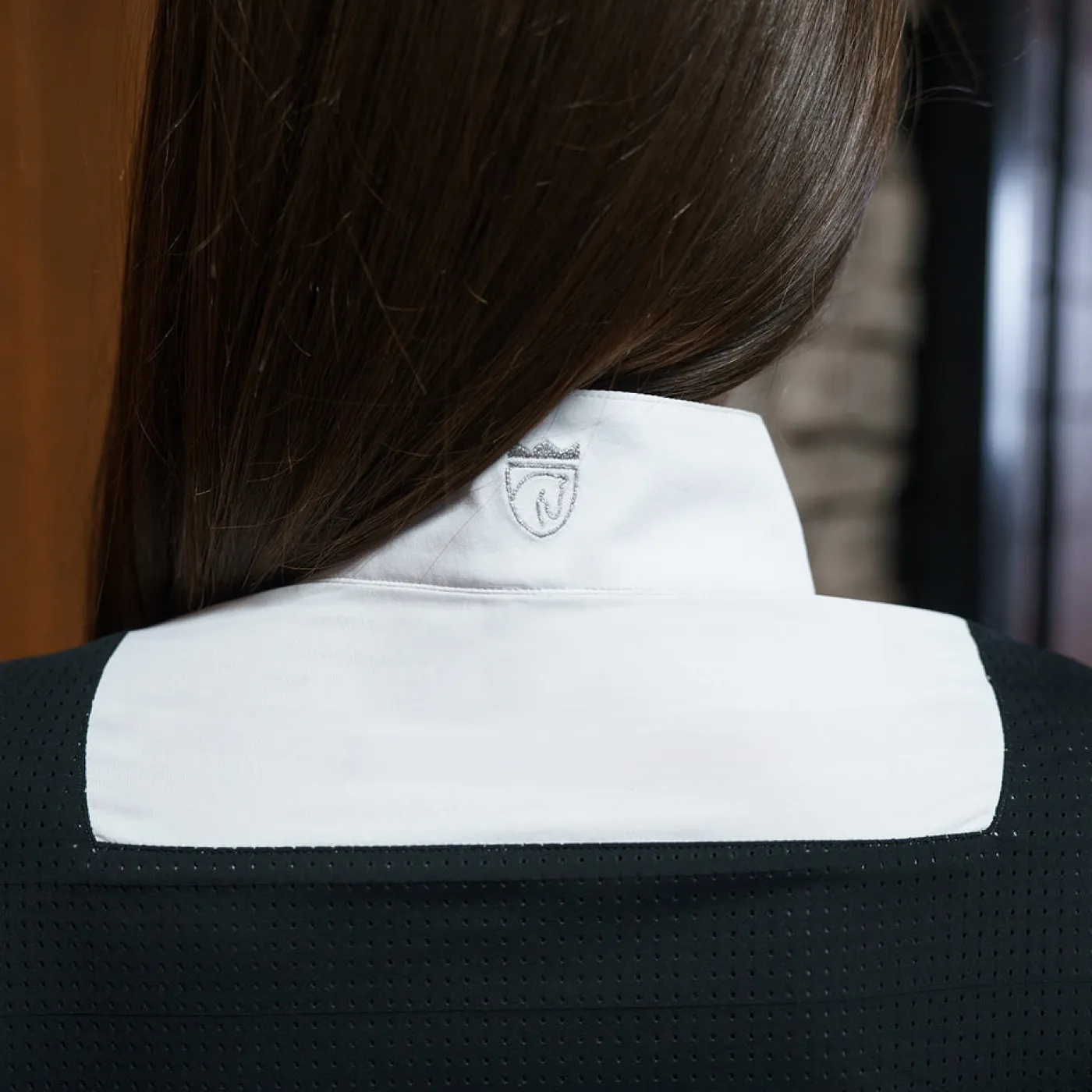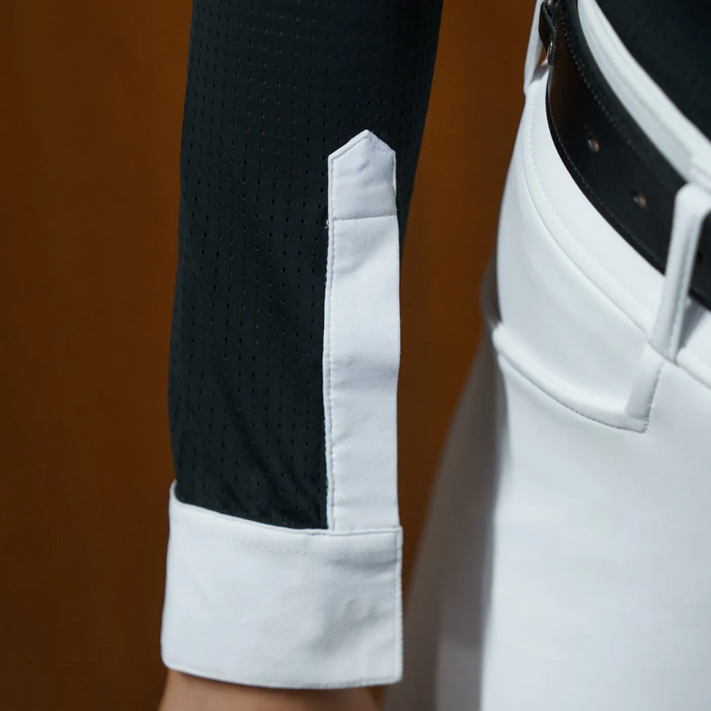 Made from perforated stretch material allowing for maximum airflow, and is ideal for hot summer days. Featuring white cuffs and bib for a crisp appearance beneath your favourite show jacket. Complete with an invisible zipper front closure and snap closure cuffs.