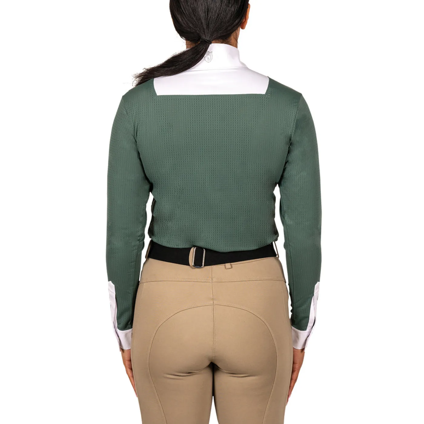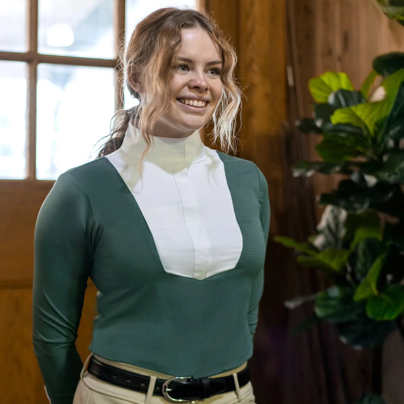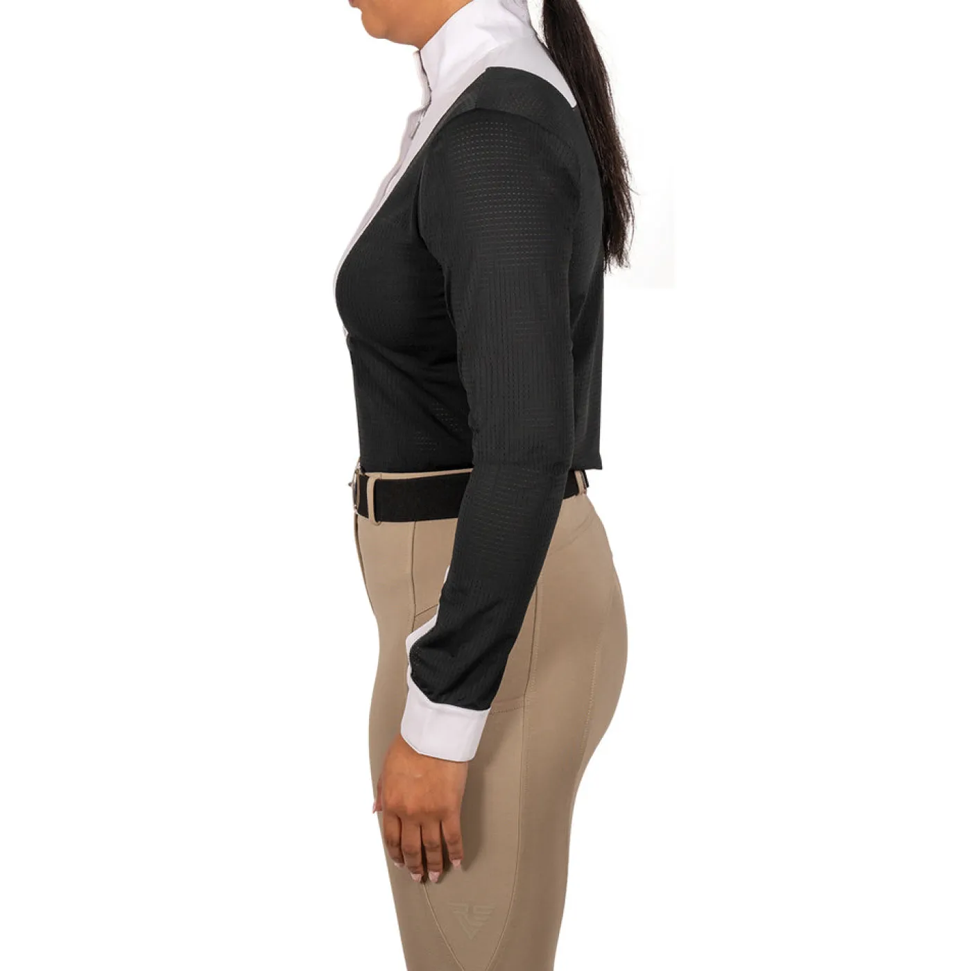 Made from perforated stretch material allowing for maximum airflow, and is ideal for hot summer days. Featuring white cuffs and bib for a crisp appearance beneath your favourite show jacket. Complete with an invisible zipper front closure and snap closure cuffs.