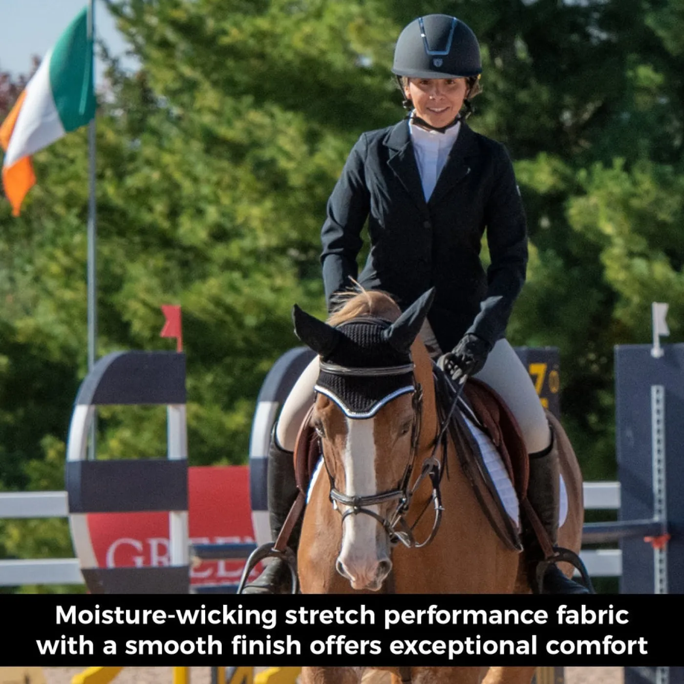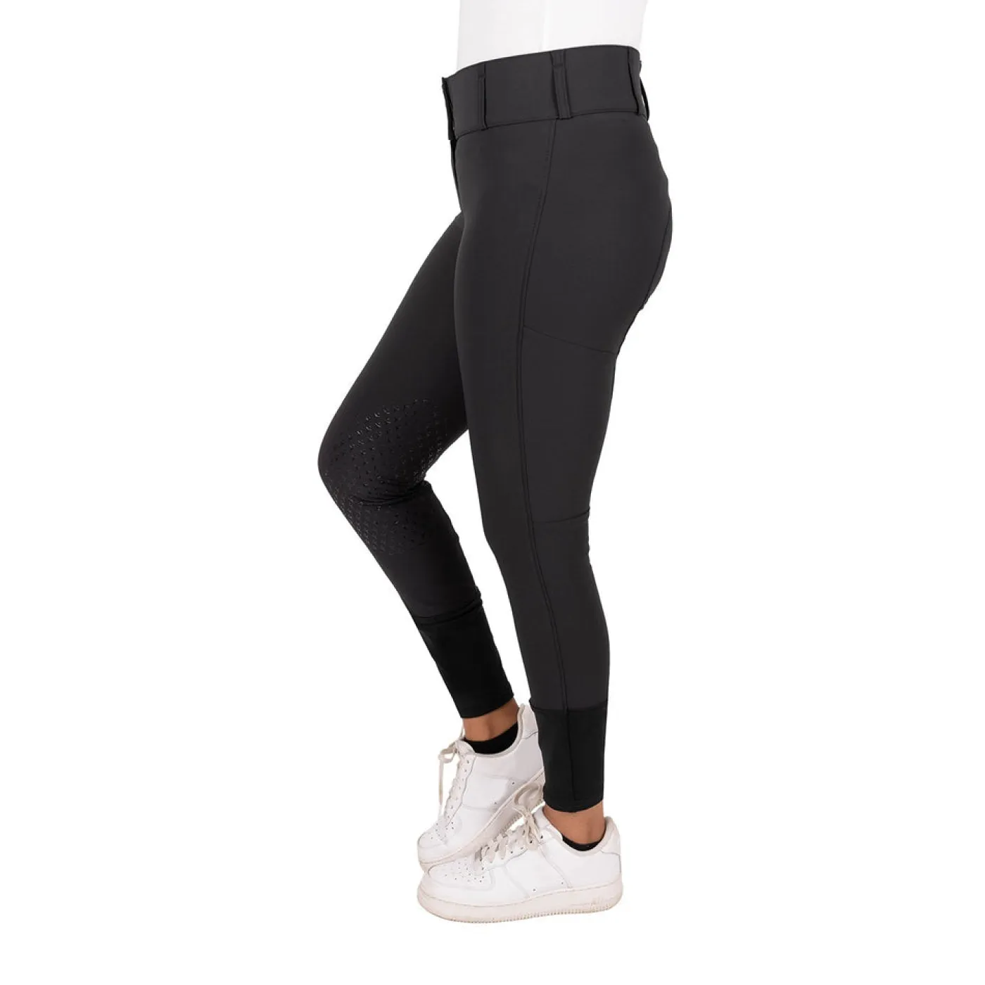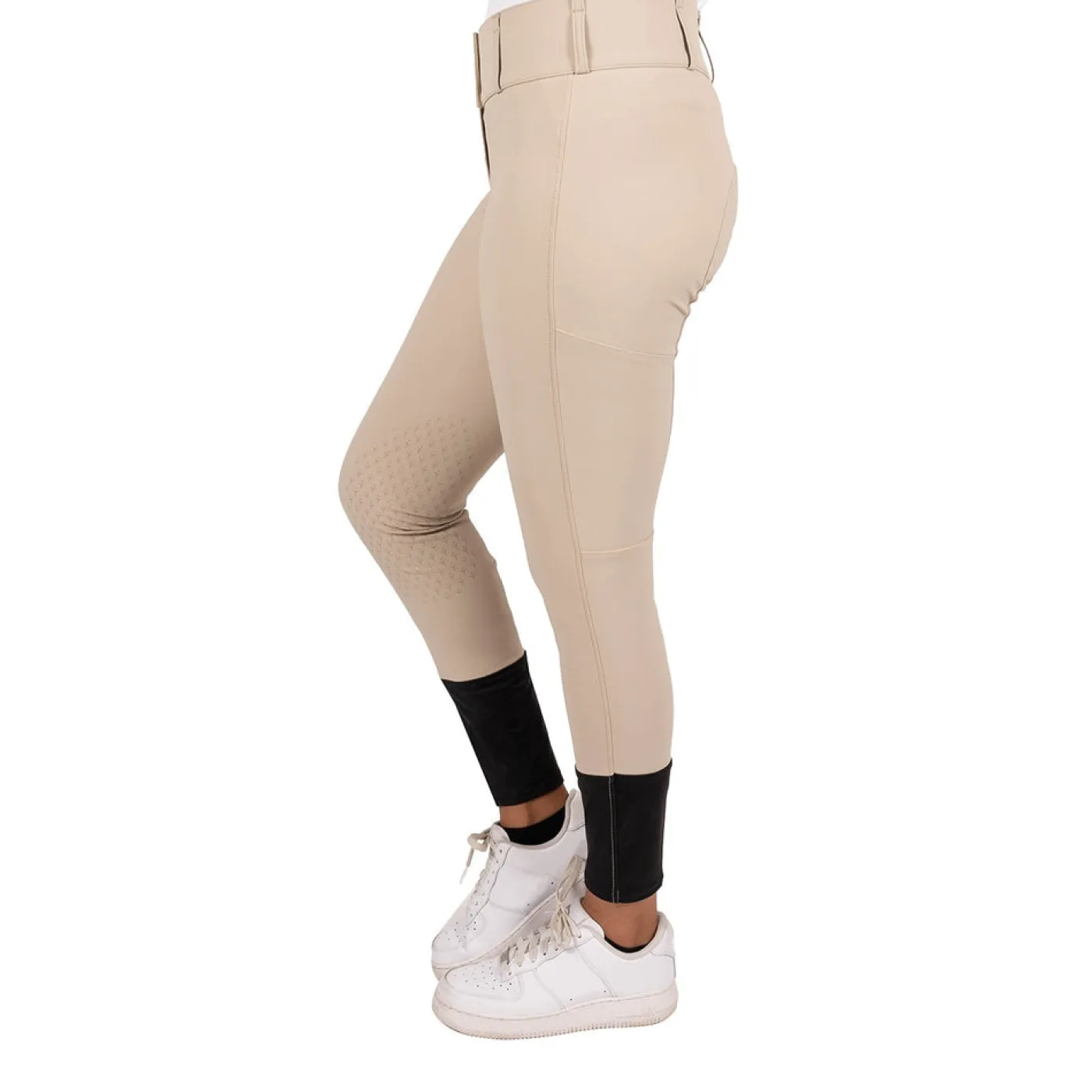 The Elation Platinum Ellis Breech offers comfort and technical performance for everyday schooling. Constructed from nylon microfibre and spandex for superior stretch and shape recovery. Features UV protection, and silicone grip knee patches for added grip in the saddle. Complete with a high waist design, 3 snap closures, a zippered thigh pocket, and elasticized socks for a smooth fit under tall boots.