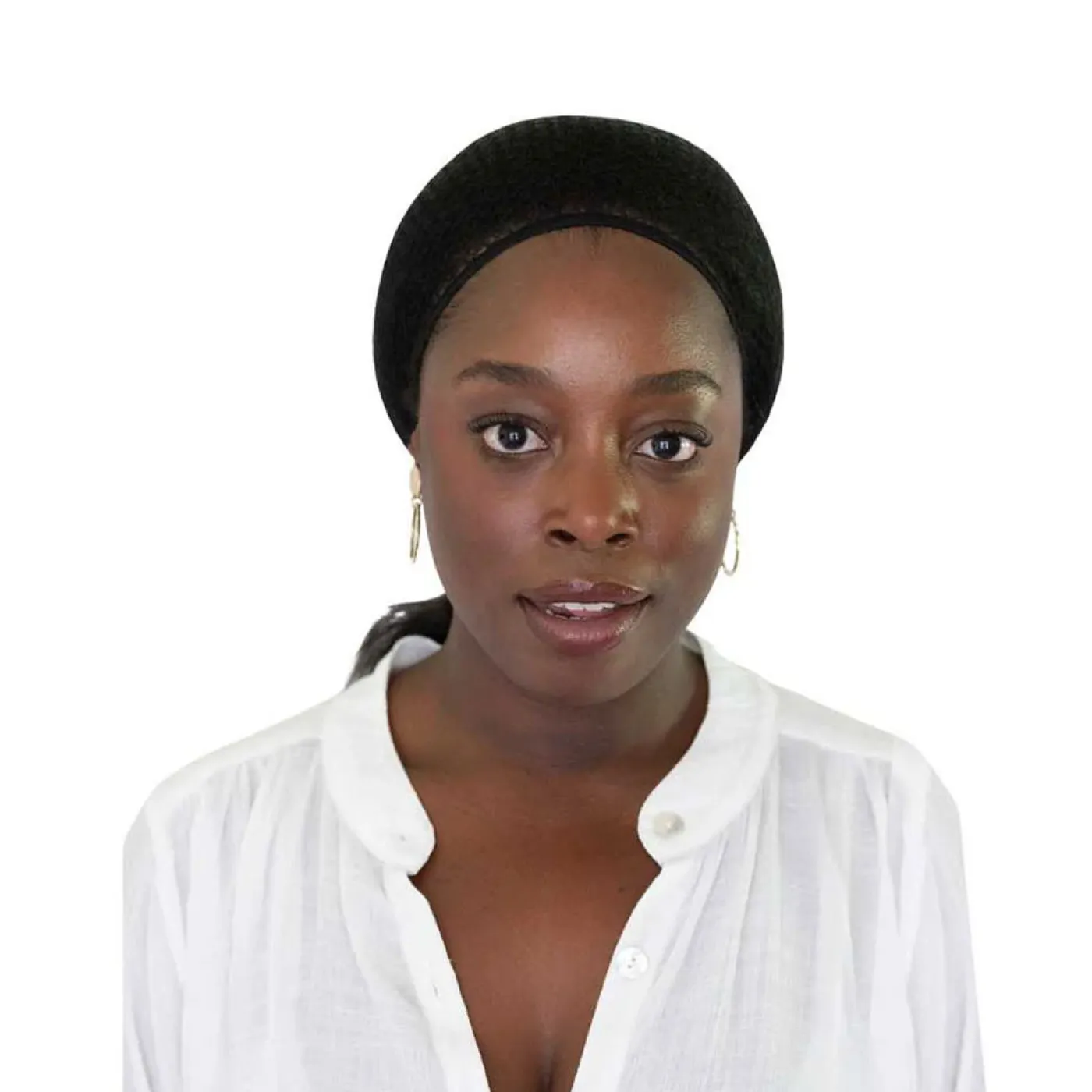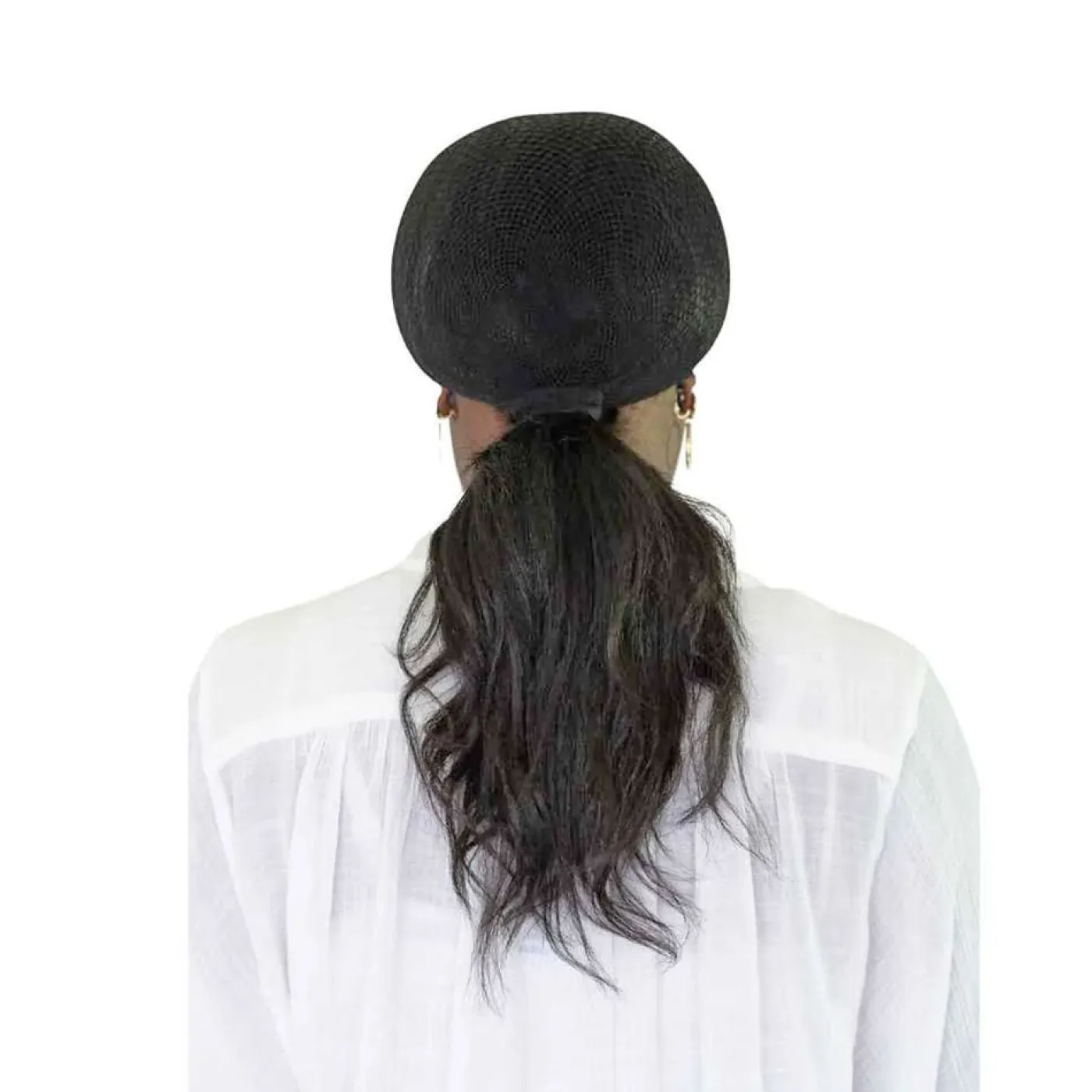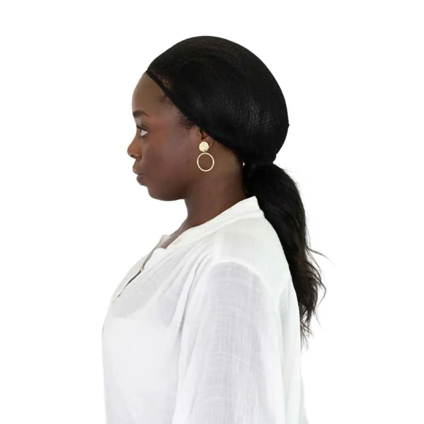 The Ellsworth Hairnet is designed to act as both the hairnet and the hair tie. Features an elastic lined hole at the back of the head to be wrapped around your ponytail.