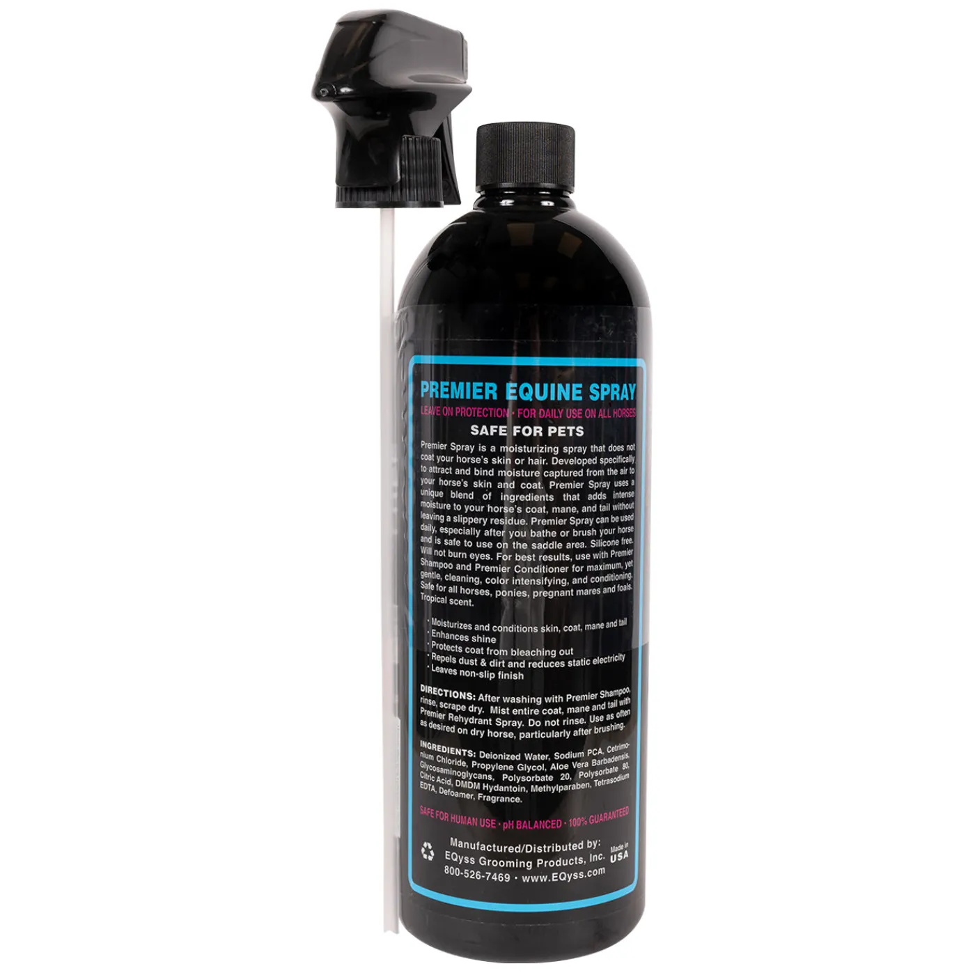 Premier Spray uses a unique blend of ingredients that helps moisturize your horse’s coat, mane, and tail without leaving a slippery residue. Premier Spray is silicone-free, leaves a non-slippery finish even on the saddle area and can be used daily to help rehydrate, condition and colour-intensify a dry mane or tail. Helps repel dust and dirt and reduce static electricity from blankets. Complete with a pleasing tropical scent.