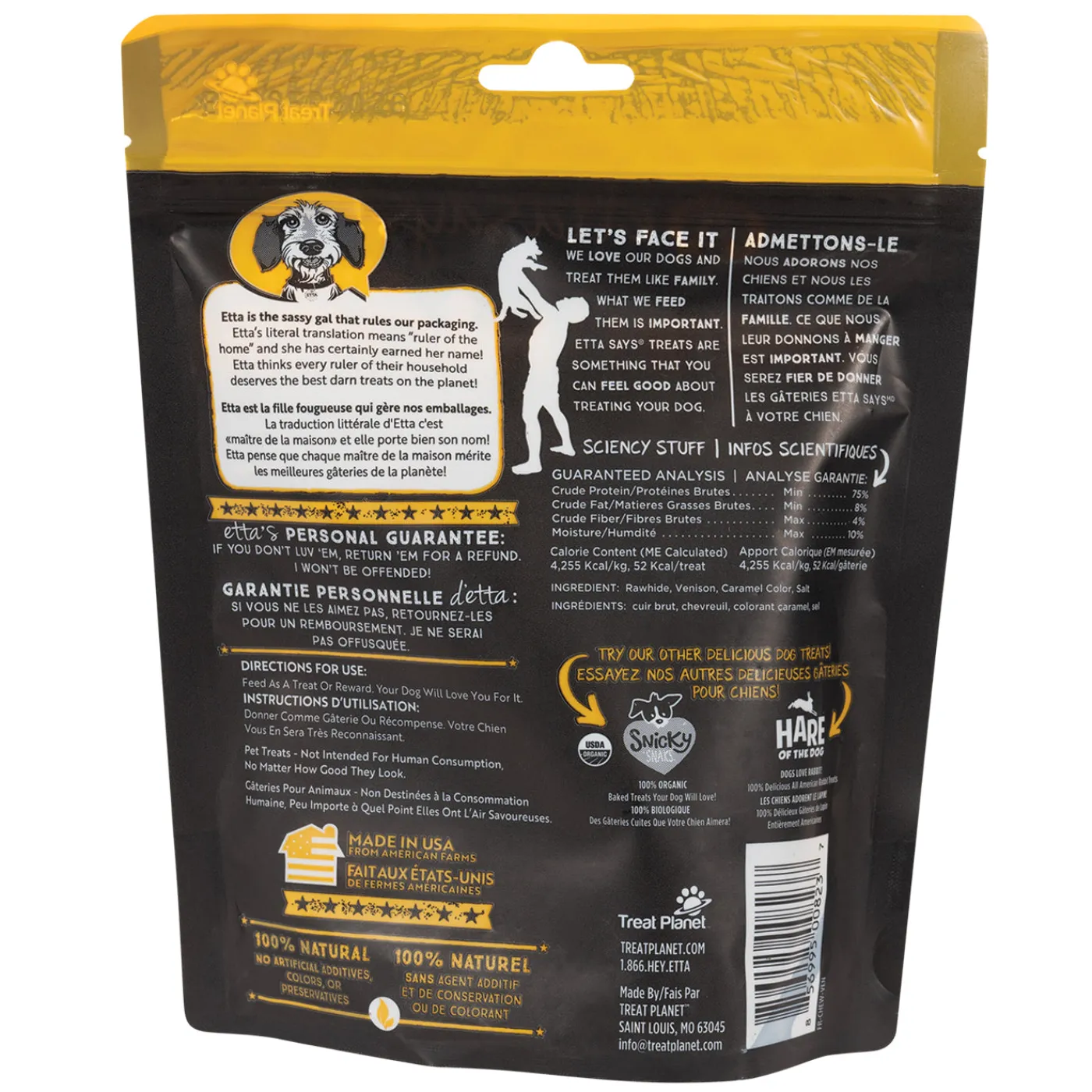 Etta Says! Crunchy Premium Chews are made from unique protein sources making them a great choice for pets with dietary restrictions. Made from premium proteins and totally odourless, these chews are safer than traditional rawhide. Each chew is made using a proprietary manufacturing process that breaks down the rawhide and blends it with high quality proteins sourced from American farms. As an added bonus, these chews won’t stain carpet or other surfaces.