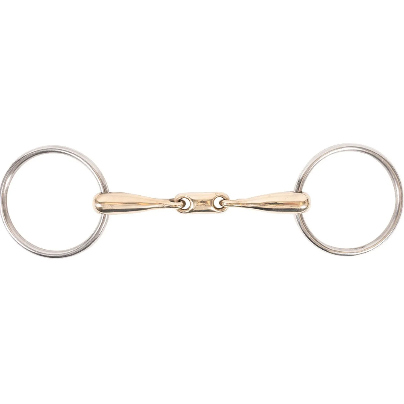 Double jointed oval mouthpiece featuring a nickel-free Cyprium-90 and stainless steel loose rings. Cyprium is a metal alloy made up of a higher percentage of copper than any other metal alloy used in bit making, and helps encourage salivation.