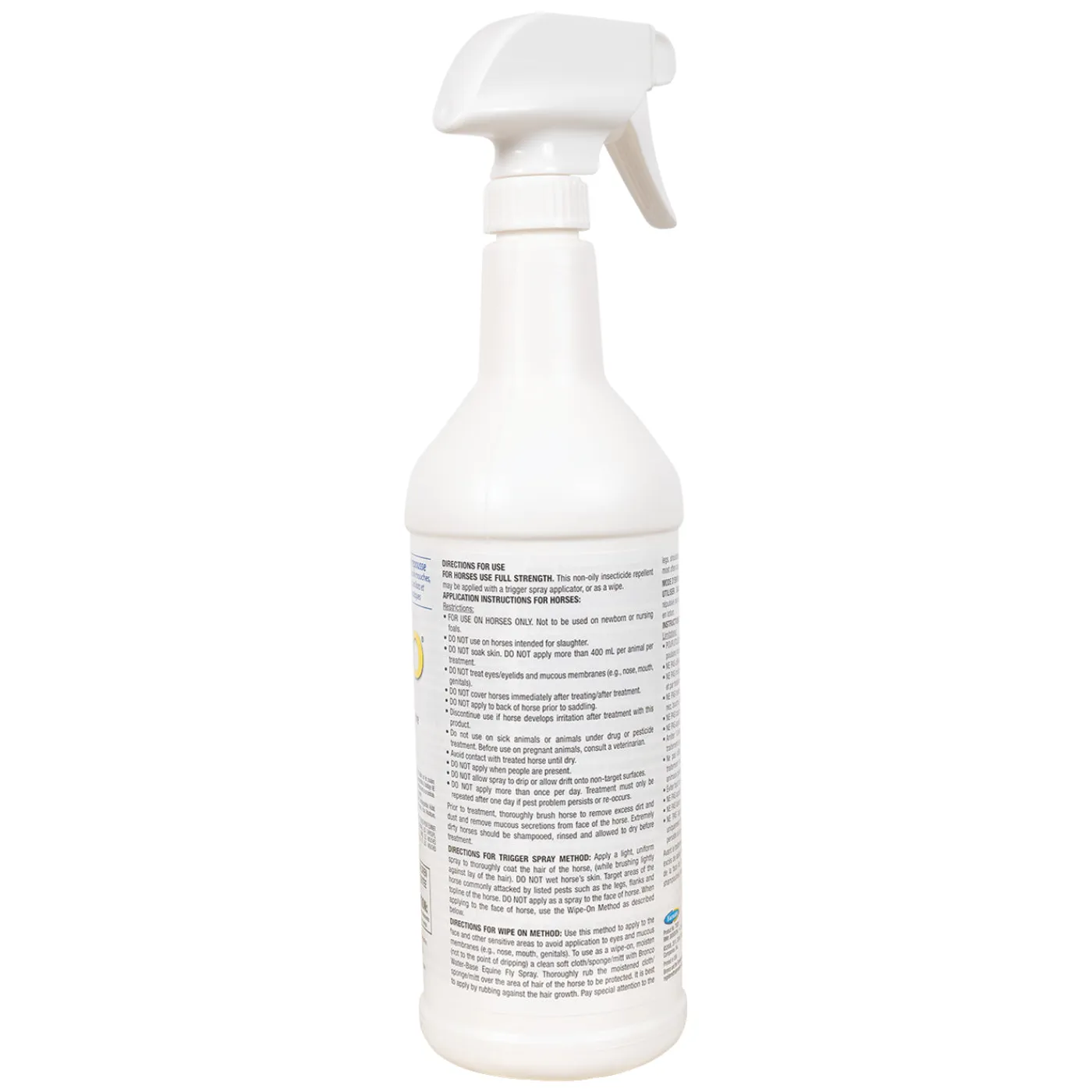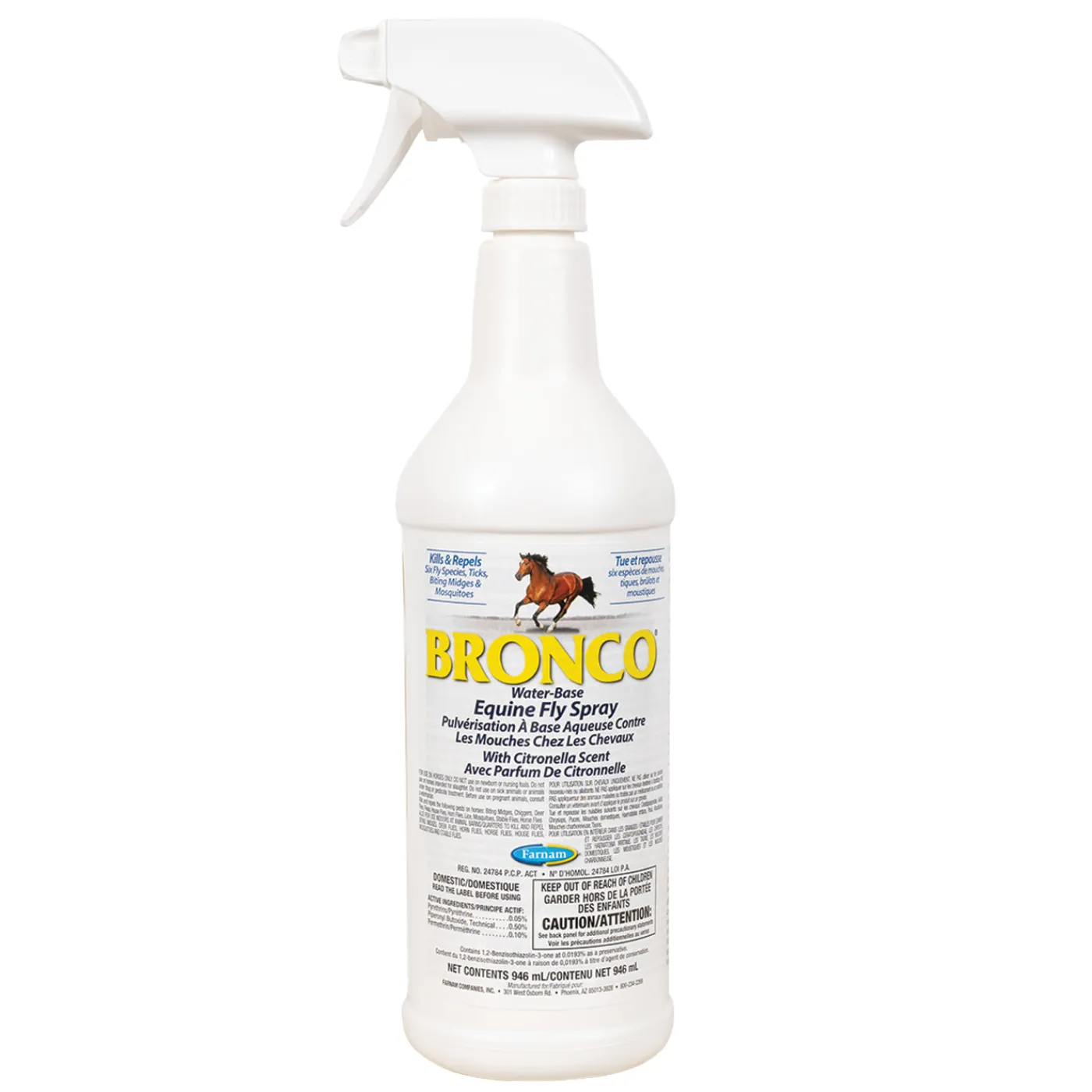 Bronco Fly Spray is a staple for every stable. The water based, ready-to-use formula is economical and effective with a pleasant citronella scent. Repels and kills house flies, face flies, horn flies, stable flies, deer flies, horse flies, gnats, ticks, fleas, chiggers and lice. Repels mosquitoes. 946 mL.
