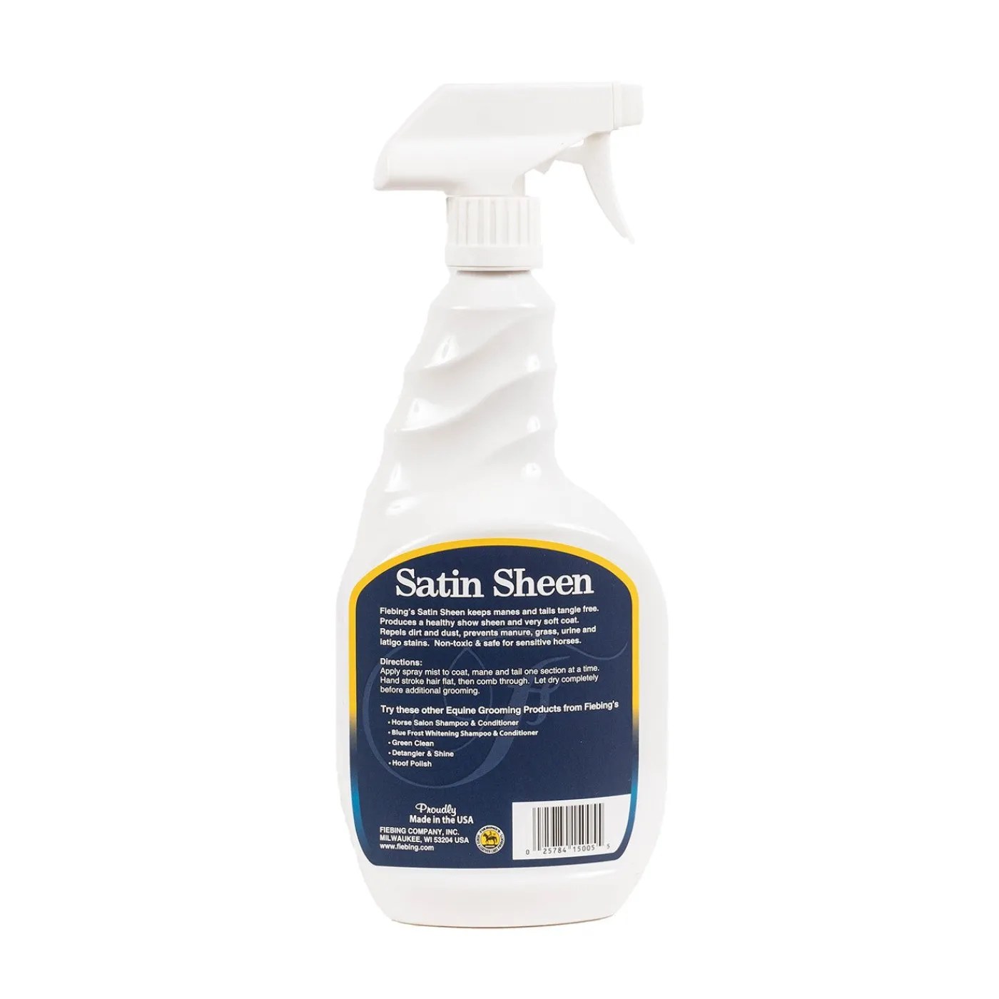 Fiebing’s Satin Sheen keeps manes and tails tangle free. This handy spray creates a brilliant sheen and soft coat that repels dirt and dust. Non-toxic and safe for use on sensitive horses. More effective yet less expensive than competing conditioners and detanglers. Comes in a fresh, clean fragrance. Made in the USA. 946 mL.