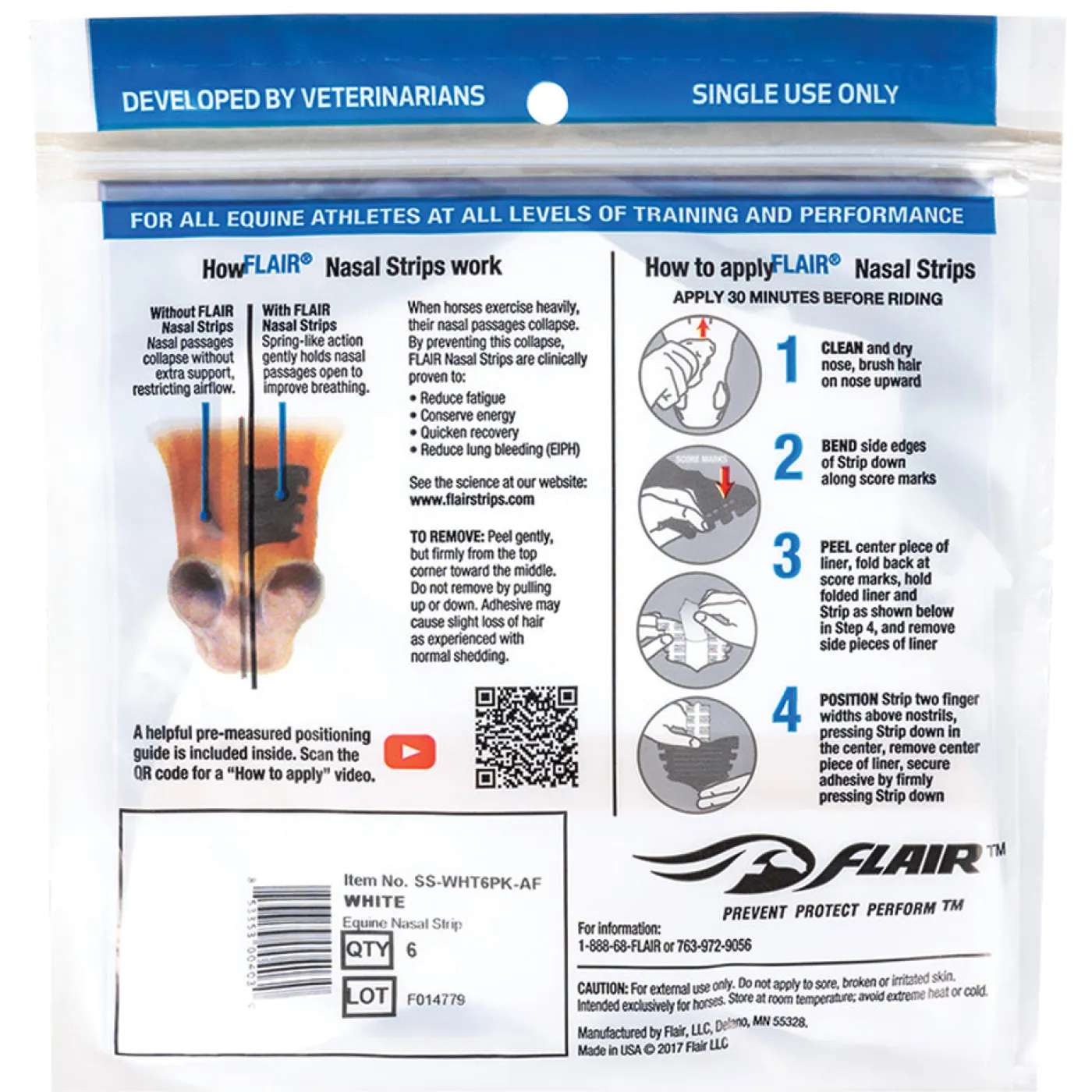 FLAIR® Strips are drug-free, self-adhesive nasal strips that support horses’ nasal passages and promote optimum respiratory health of equine athletes, in all disciplines and every level of competition. Comes in a pack of 6.