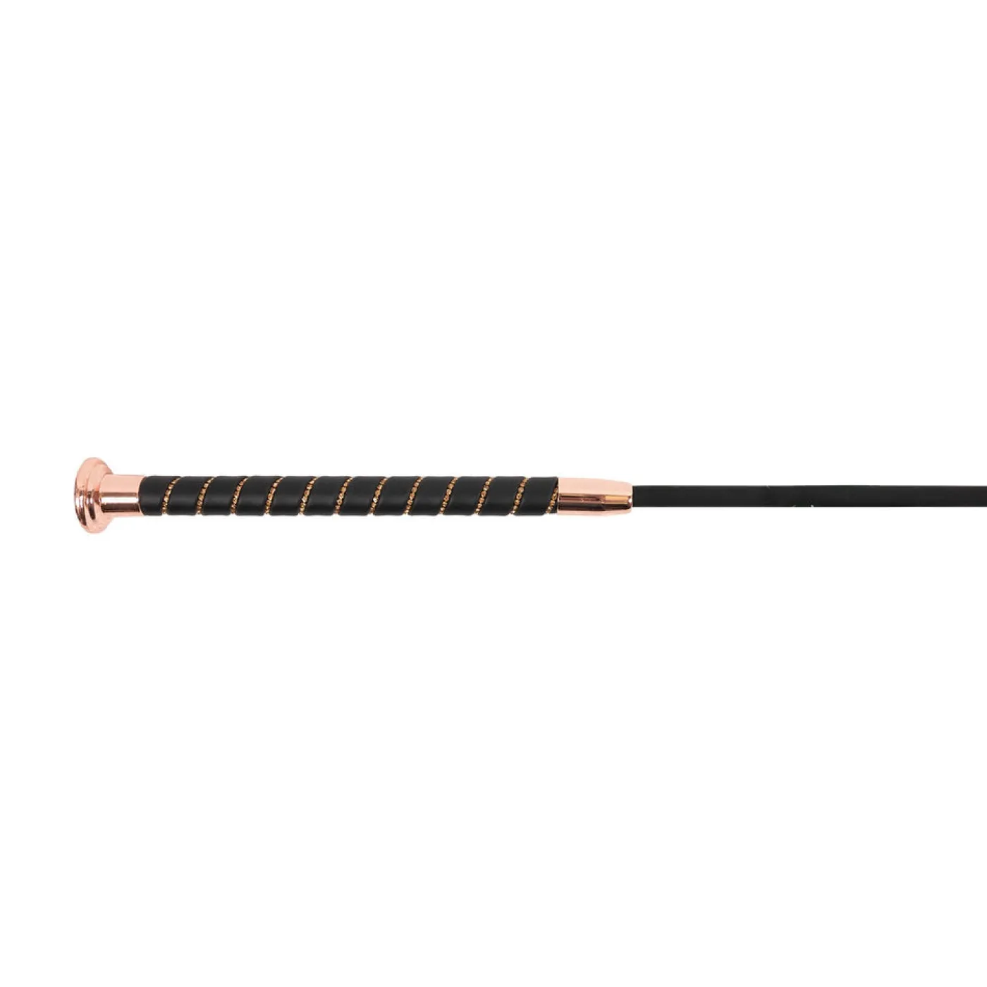 Luxurious and elegant dressage whip with crystal-embellished grip, noble metal fittings in rose gold complete with rose gold crystals, and fibre glass shaft whip with Silk Touch-coating. 48″/120 cm long.