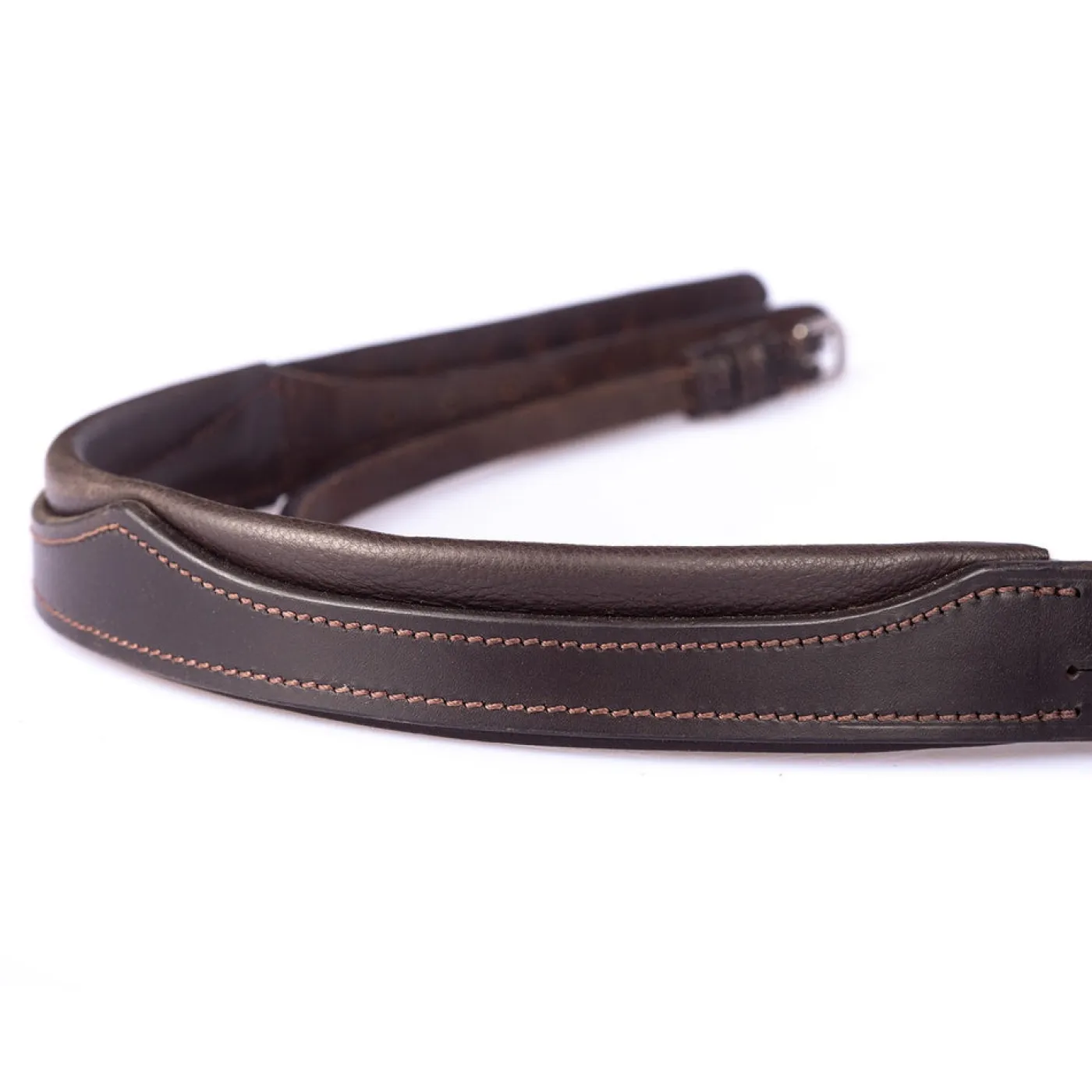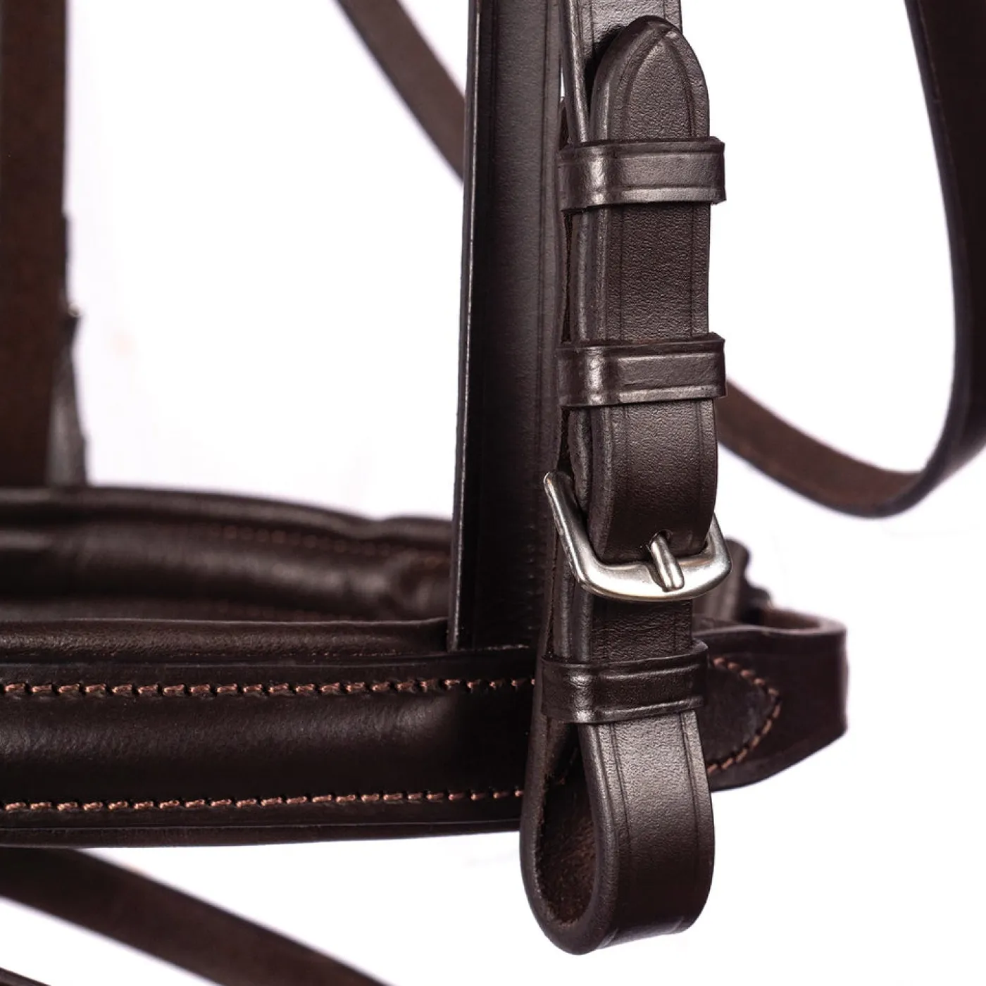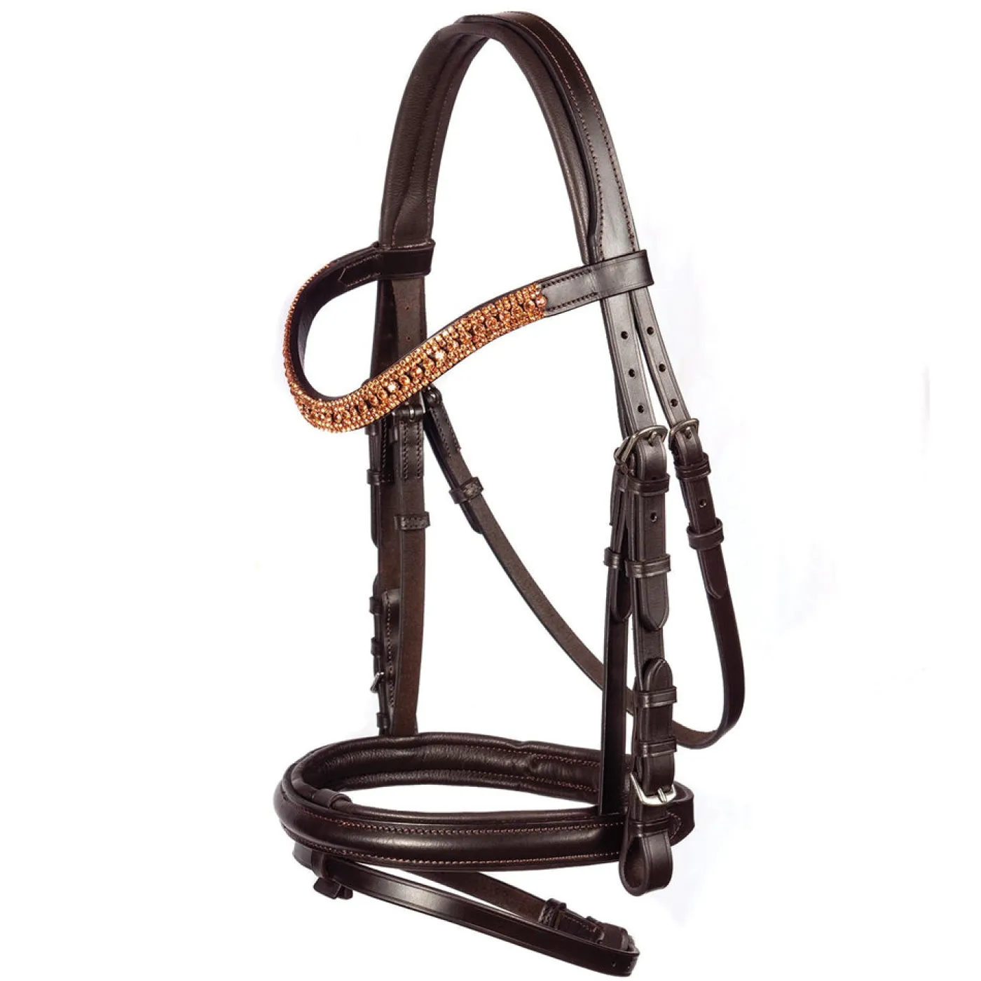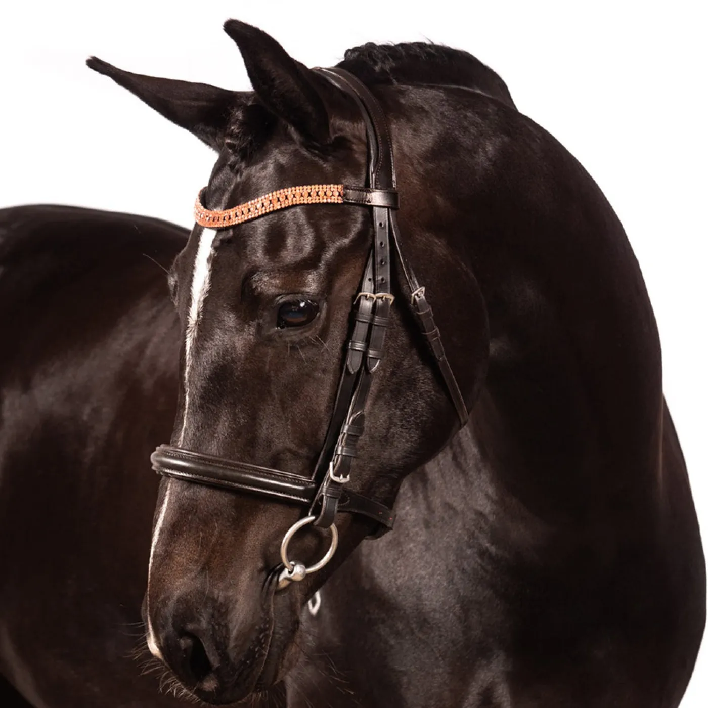Flattering dressage bridle hand crafted from the finest quality leather. Princess wave browband includes five rows of stunning rose gold Swarovski crystals, featuring one larger row and four smaller rows. Unique gel pads the crownpiece, noseband and browband, activated by your horse’s body heat to help mold to the shape of their head with use. Complete with stainless steel hardware, billeted cheekpieces, and monocrown construction. Crank noseband is cut in an anatomical style, widest at the bridge of the horse’s nose, and tapers off to a narrower width at the sides of the face. Complete with a removable flash attachment. Reins not included.
