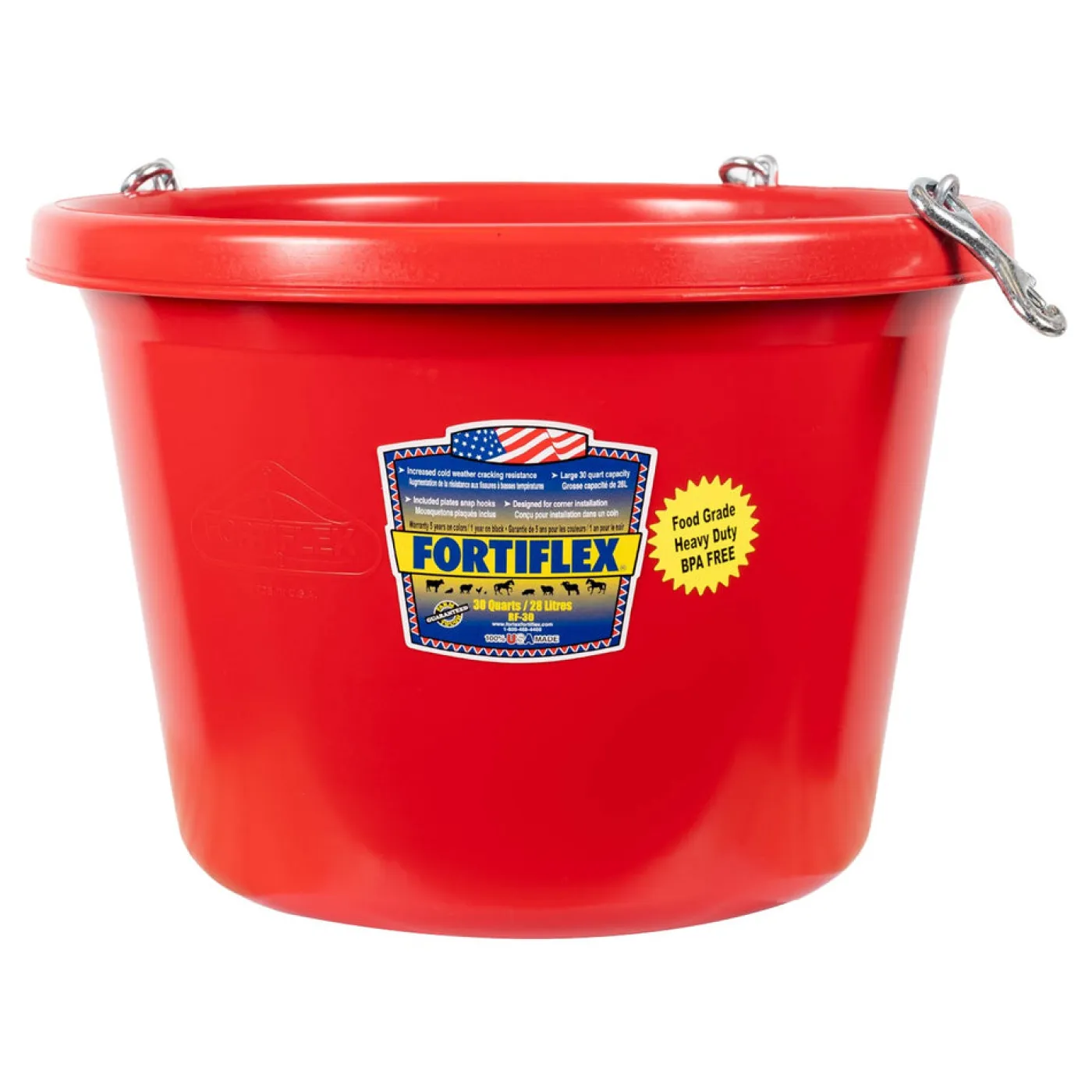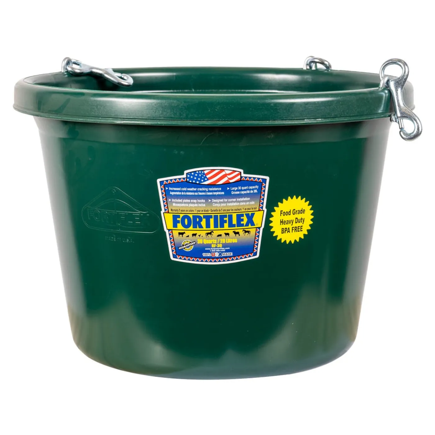 Make sure your horse enjoys every meal time with the Fortiflex Round Feeder. This bucket has a 30 quart capacity and is supplied with steel snap hooks for sturdy installation. Built-in UV protection ensures this bucket will not fade. Designed to resist cracking in cold weather. Compatible with the Fortiflex Feed Saver Ring (sold separately).
