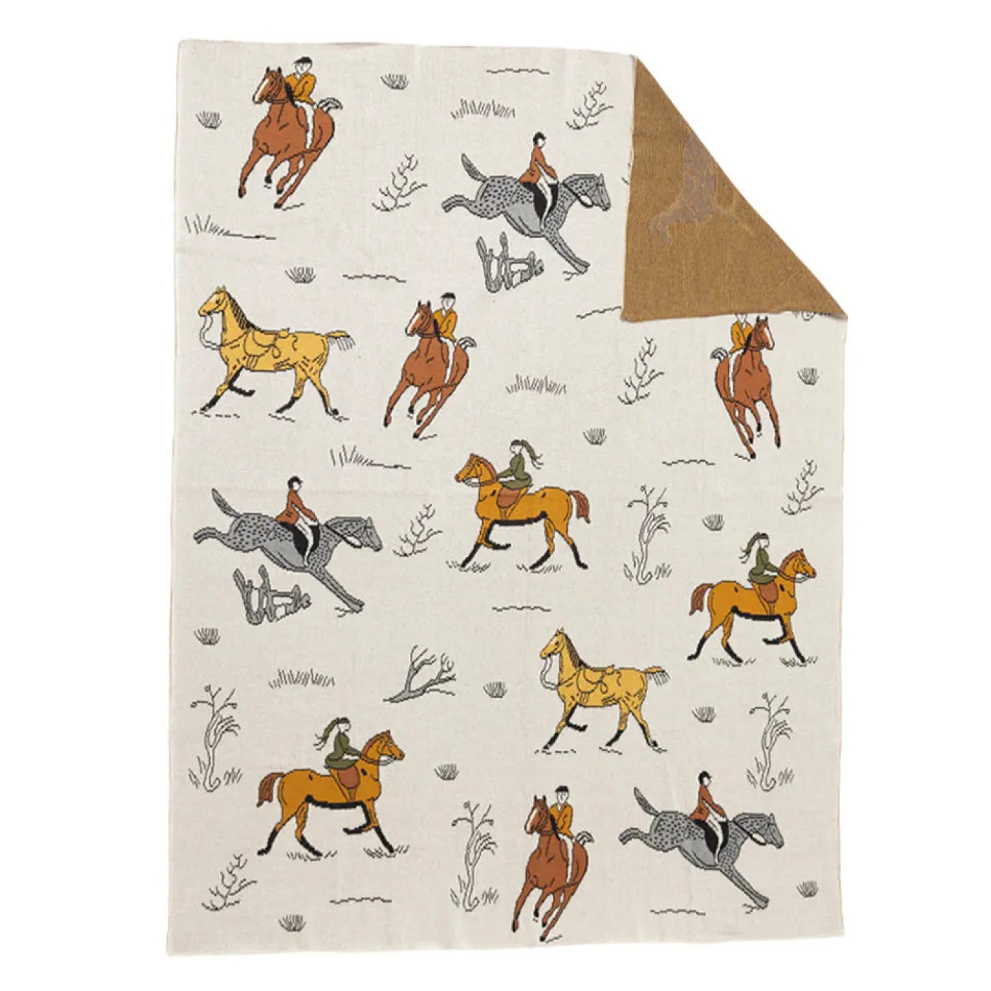 Riders of all kinds are jubilantly depicted in this lovely throw. It’s will be a charming addition to any space. Its knitted cotton construction will keep you and yours warm and snug anytime!
