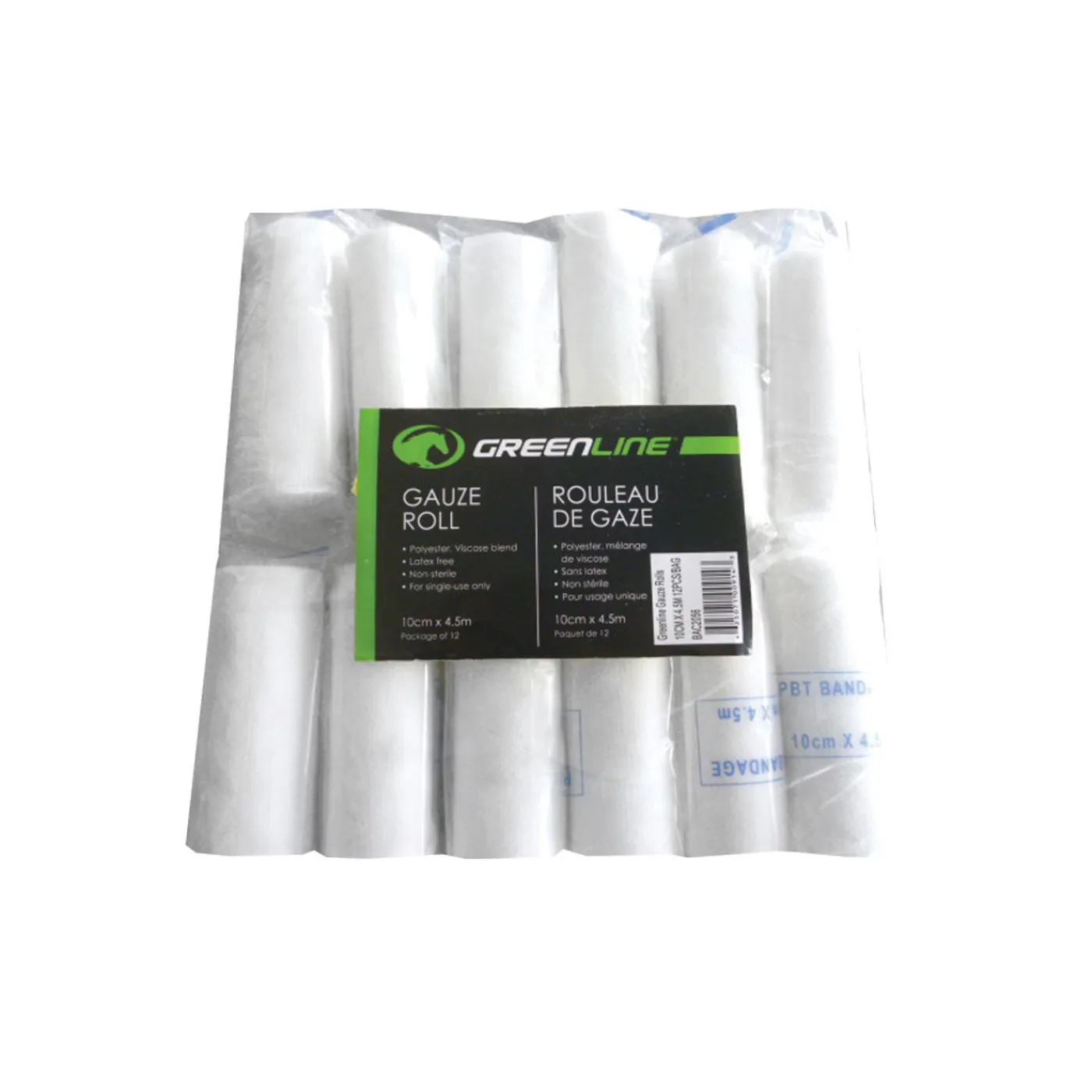 Greenline Gauze Rolls are a conforming gauze bandage used to effectively hold dressings in place. This bandage will delicately wrap around while adhering to itself to cover and protect wounds from further injury, contamination, or infection. Created from a Polyester-Viscose blend, these bandages are latex free, non-sterile, and for single-use only. Each roll measures 10cm W x 4.5m L. Sold as a package of 12.