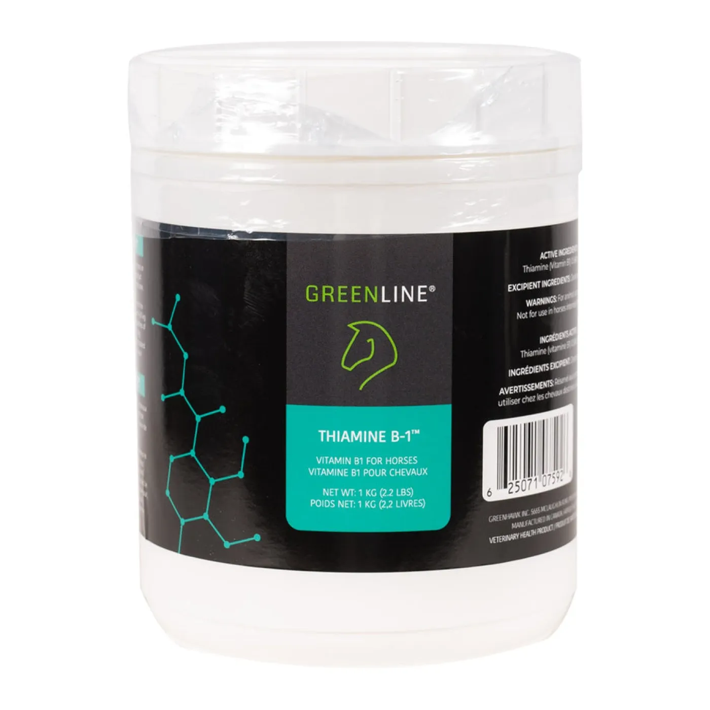 Greenline is the leading supplementation program at racetracks and competitive barns across Canada. Greenline Thiamine helps to promote a healthy hindgut and overall horse health. Thiamine (Vitamin B1) plays a role in the proper transmission of nerve impulses, allowing horses to feel more focused and at ease. Ideal for active, working horses, this supplement helps allow horses to feel more focused and at ease. Supplement with Thiamine to help calm a nervous horse or to help focus horses that are easily distracted. Supports hindgut health. Greenline Thiamine Powder contains 500 mg of Thiamine per 30 g dose. Packaged in a convenient resealable tub. Proudly manufactured in Canada.