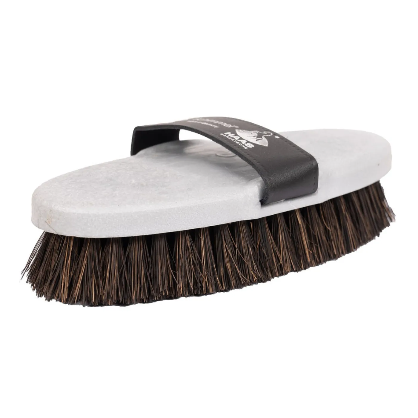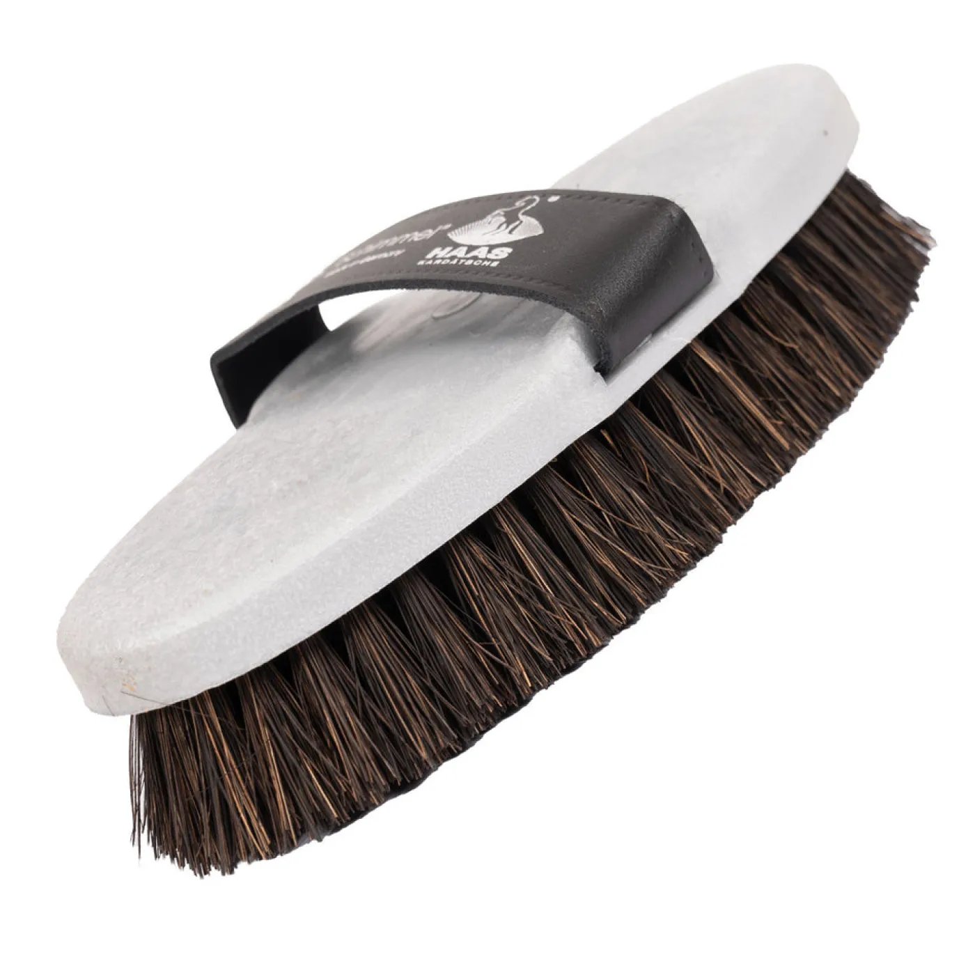 The Haas Schimmel Brush is constructed with a mixture of tight, strong coconut fibres. Suitable for grooming grey or white horses and may be used to groom stubborn stains.