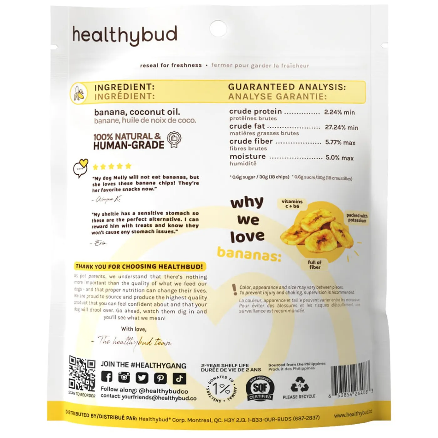 Healthybud Banana Crisp dog treats are an all-natural, low-calorie treat for dogs of all sizes! Coated with coconut oil to give an extra crunchy texture, these vegan chips are packed with potassium with no added sugar or salt.