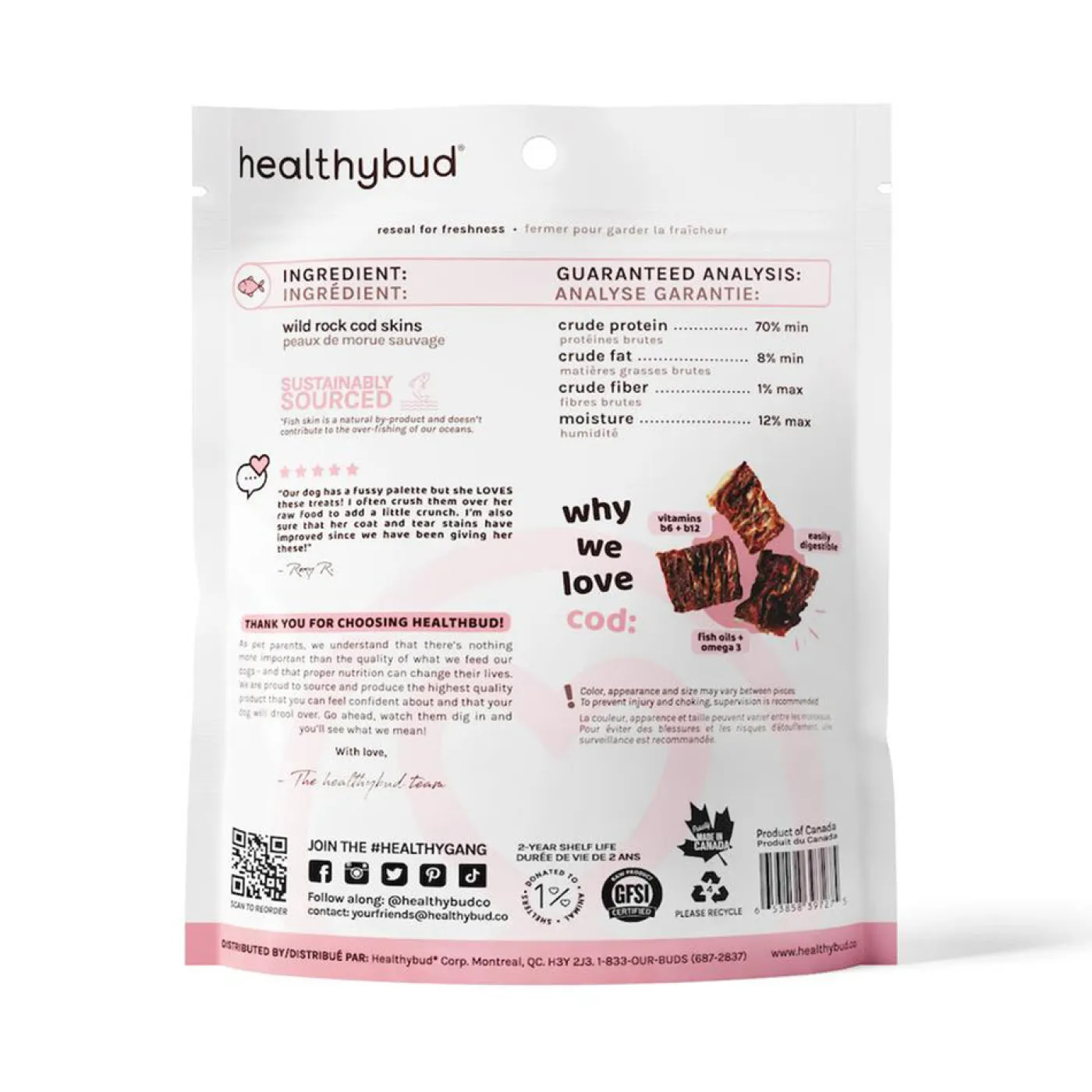 Made from 100% sustainable and wild-caught Pacific rock cod skins, these treats are the perfect hypoallergenic treat. Rich in Omega-3s for healthy skin and coat. Air-dried to retain nutrients, flavour and crunch. The perfect choice as a high reward training treat!