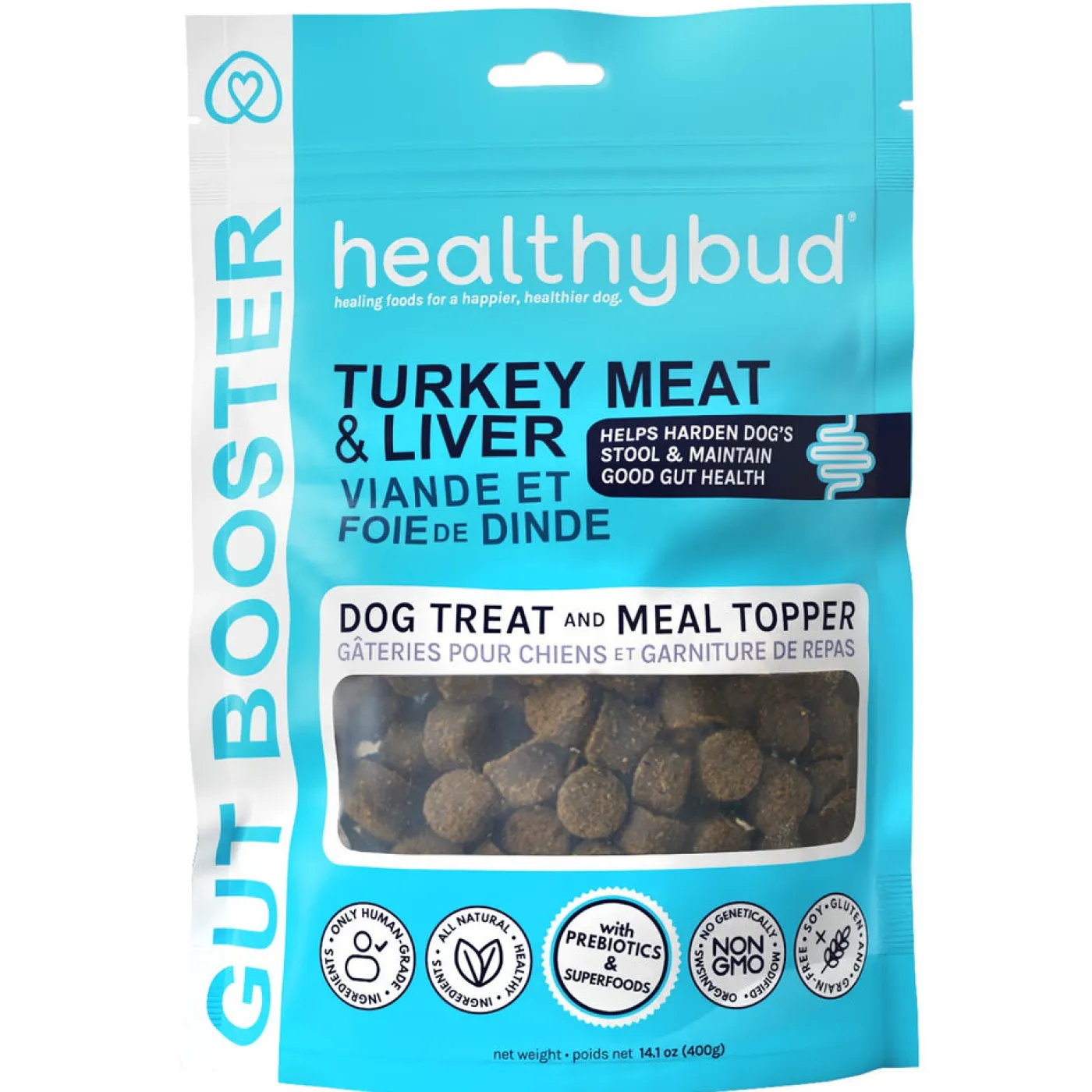 Healthybud Gut Booster helps to improve digestive health using prebiotics, digestive enzymes and superfoods for good gut bacteria. Packed with delicious flavour and nutritious ingredients that your dog will love. Can be used as a meal topper or as a treat. Made with all natural ingredients.