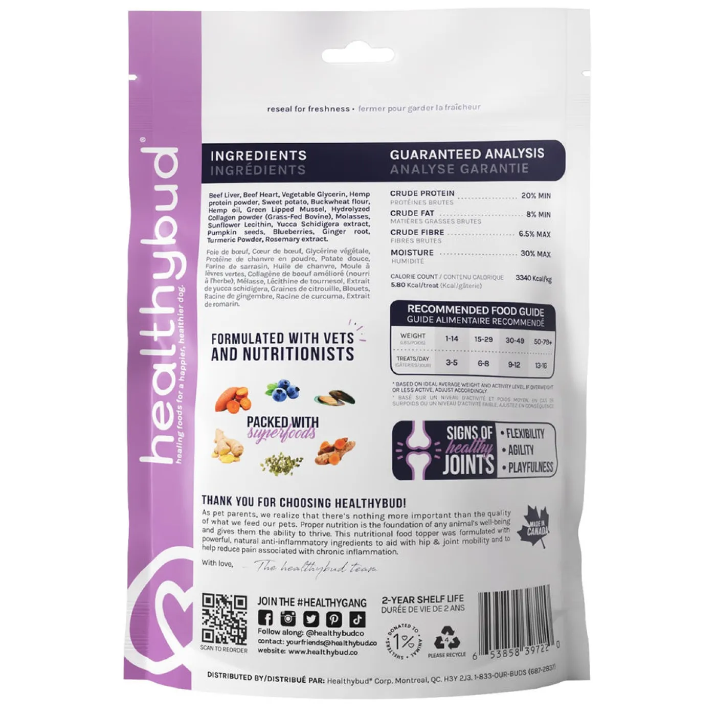 Healthybud Joint Booster is crafted to help hip and joint mobility while reducing and preventing pain associated with inflammation. Can be fed as a meal topper or a treat. Made with human grade, 100% natural ingredients that contain no artificial additives, fillers or animal by-products.