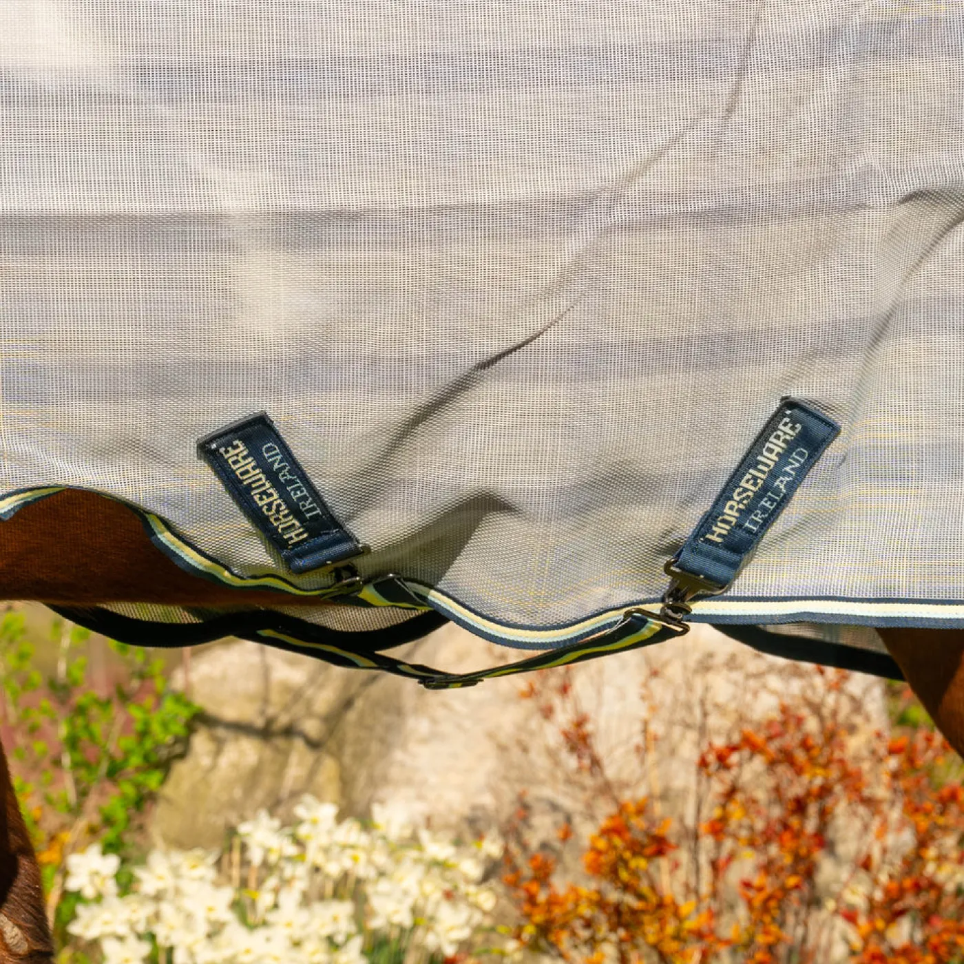 Great for keeping your horse protected from insects and UV in a breathable, and durable woven Polyester mesh. Provides maximum coverage with an extra large tail flap and a detachable hood. Complete with classic straight front closures and cross surcingles for a secure fit.