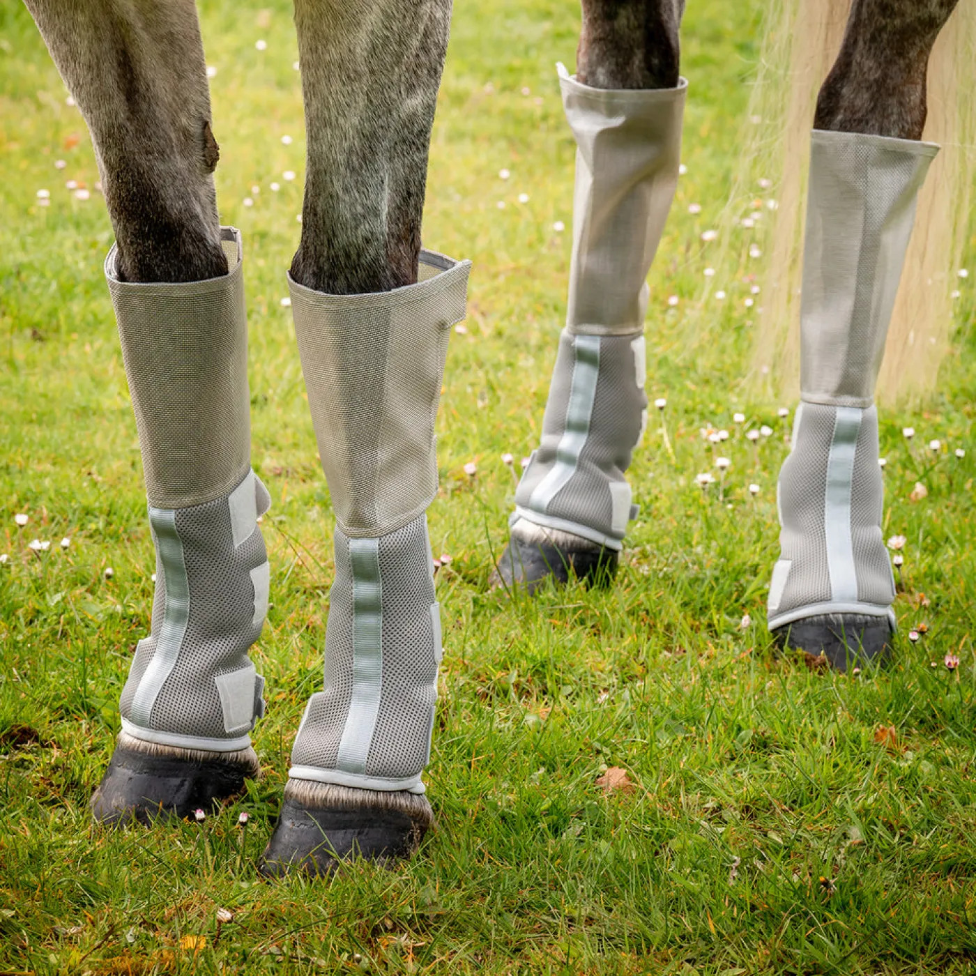 The Rambo Tech-Fit Fly Boots offer a light and breathable textilene upper fabric with a 3D airmesh lower section. This hybrid boot combines fabric to offer advanced fly protection and the advanced shape reaches up the horse’s knee and hock for maximum coverage. Complete with a funnel top section to deter insects, Velcro closures and UV protection.