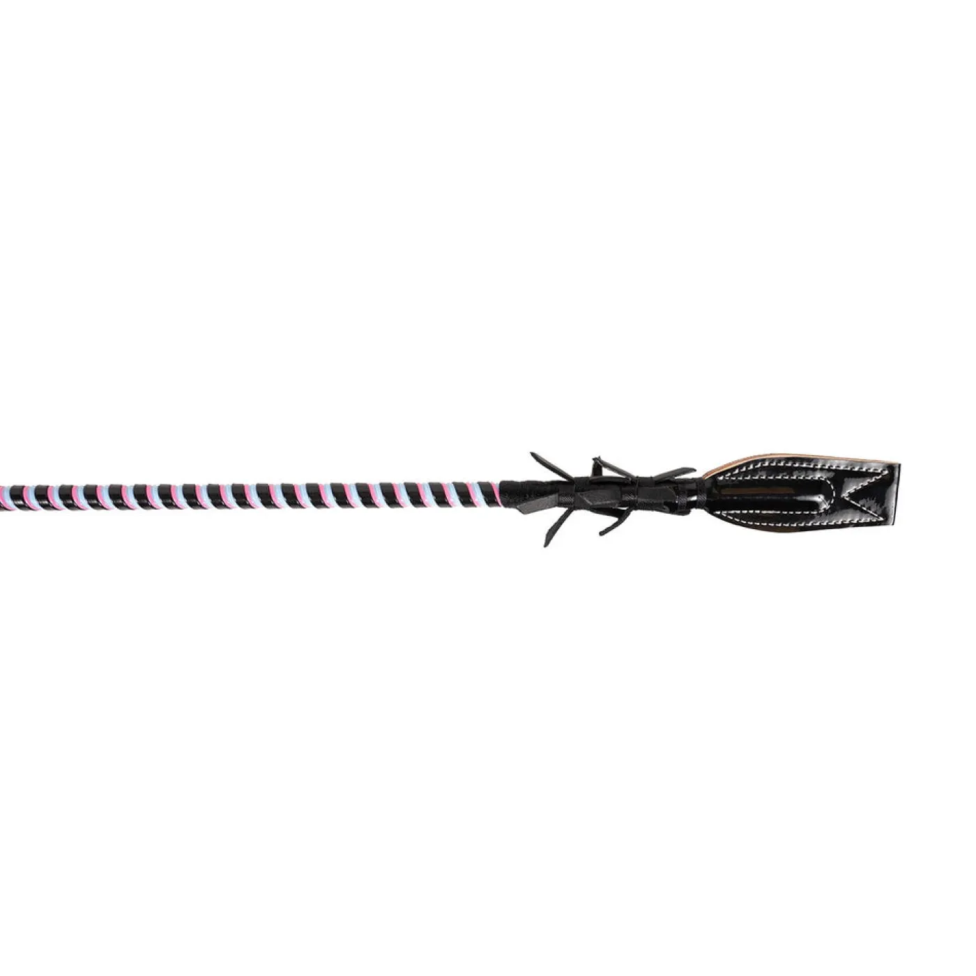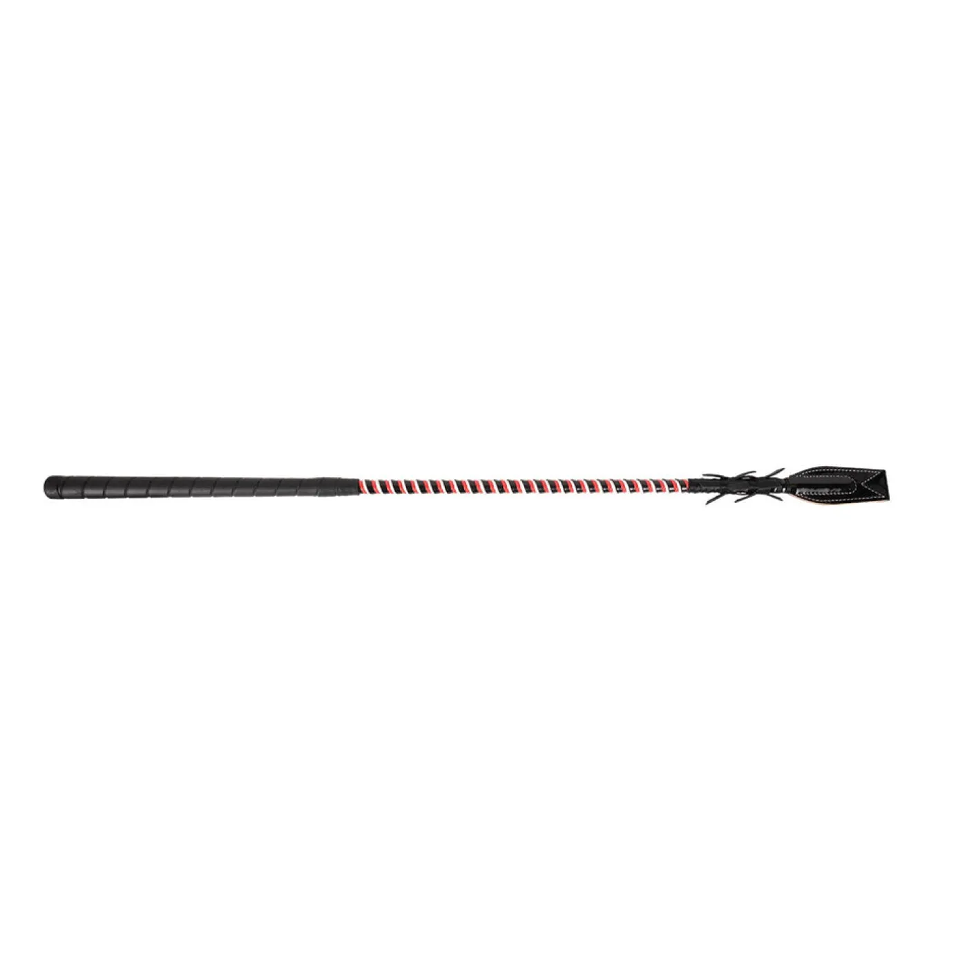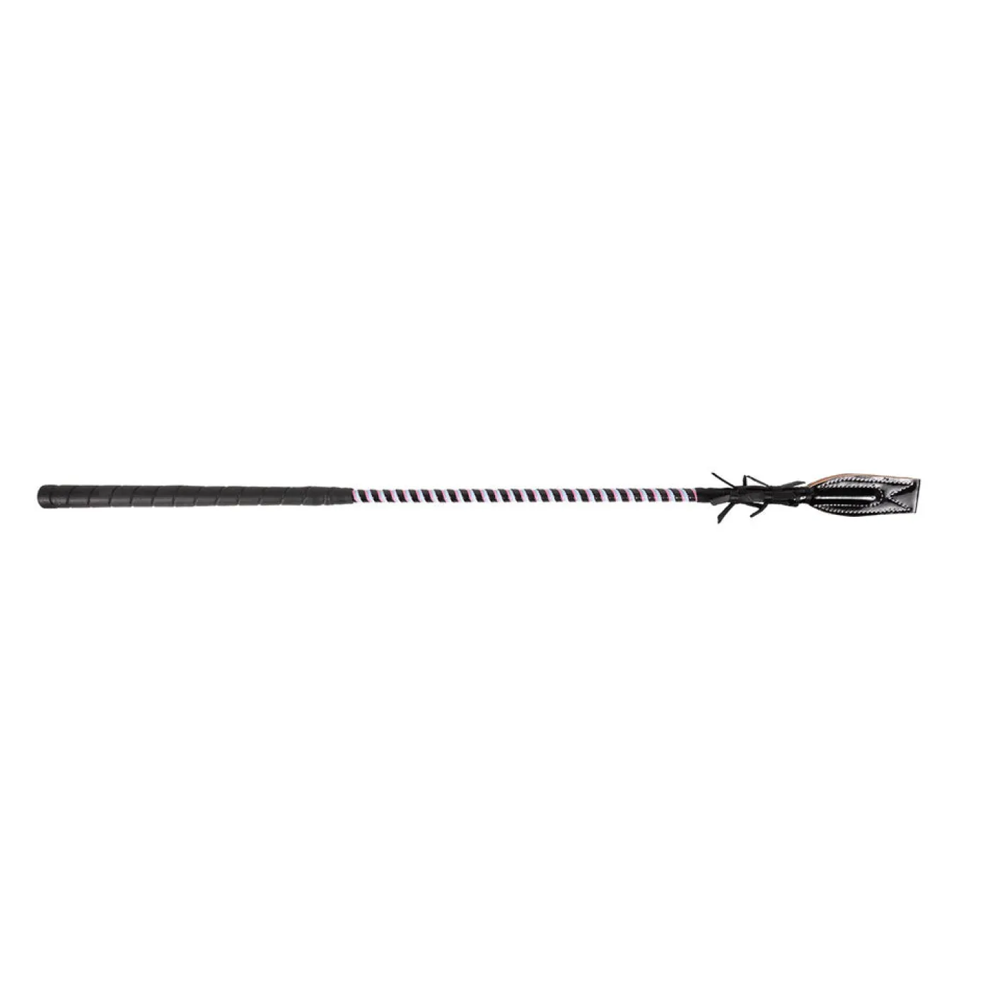 The Racing Bat has a golf style grip and plastic wrapped fiberglass shaft with a thick leather curved flapper & feathers. 30″/76 cm L.