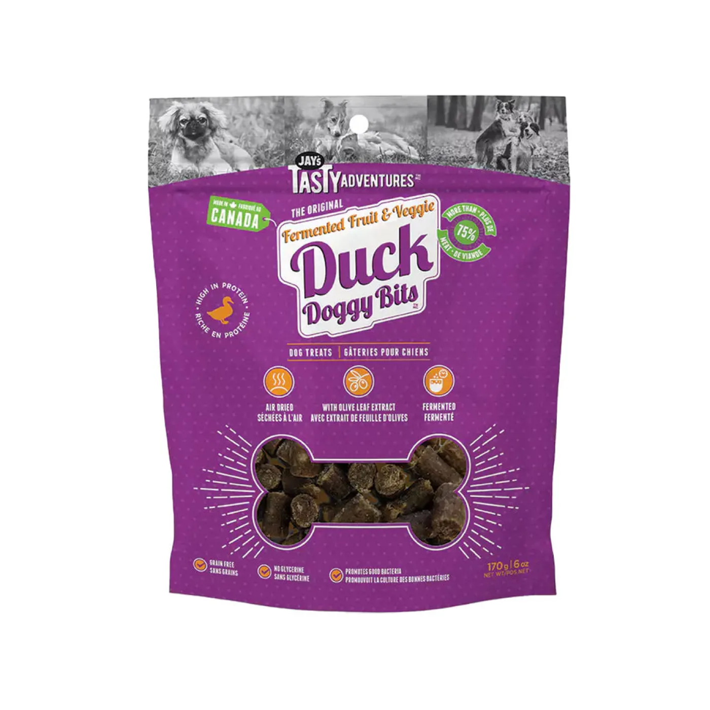 Jay’s Tasty Adventures Fermented Fruit & Veggie dog treats are infused with fermented fruits and vegetables, and olive leaf extract. Raw dehydrated and made from fresh meat using single sourced animal proteins.