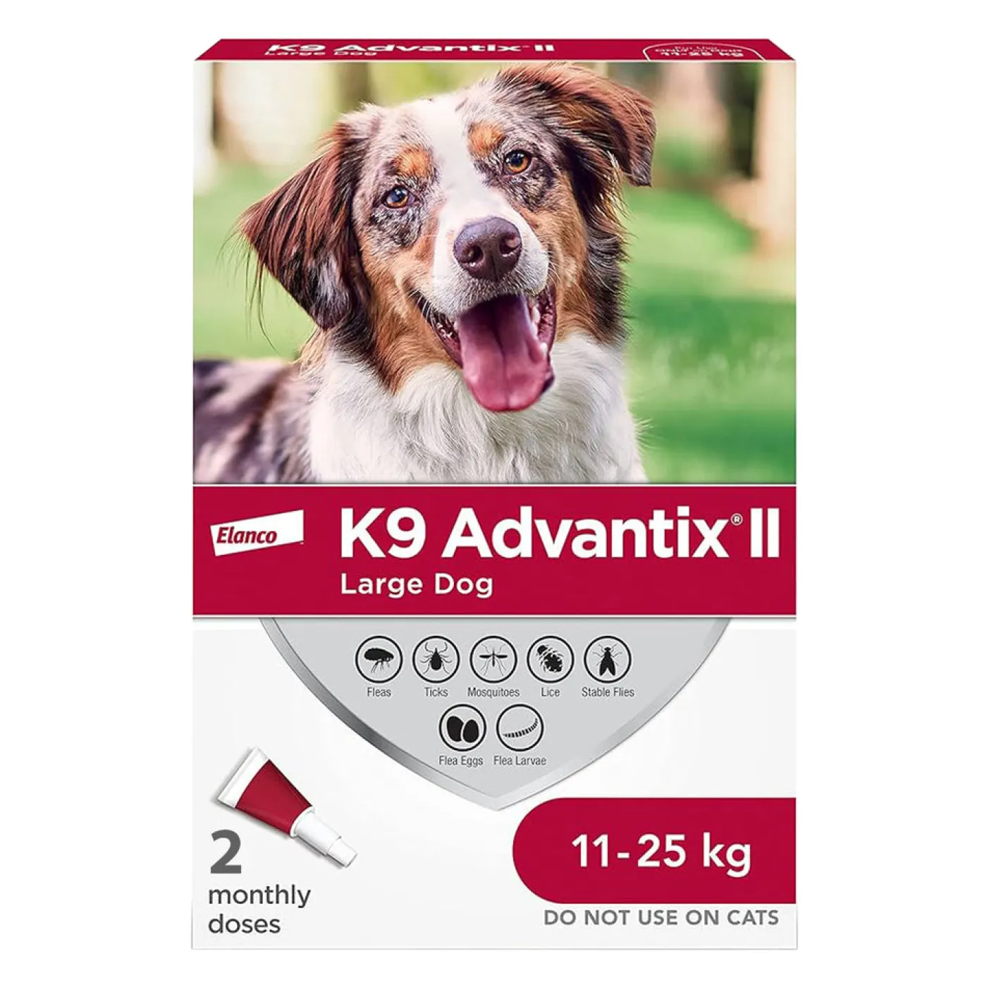A convenient monthly topical application that kills and repels fleas, ticks and mosquitoes. It’s specially formulated for dogs with imidacloprid, permethrin and pyriproxyfen for broad spectrum protection against these ectoparasites that can transmit diseases. K9 Advantix® II is for use on dogs 8 weeks and older and weighing 11-25 kg.