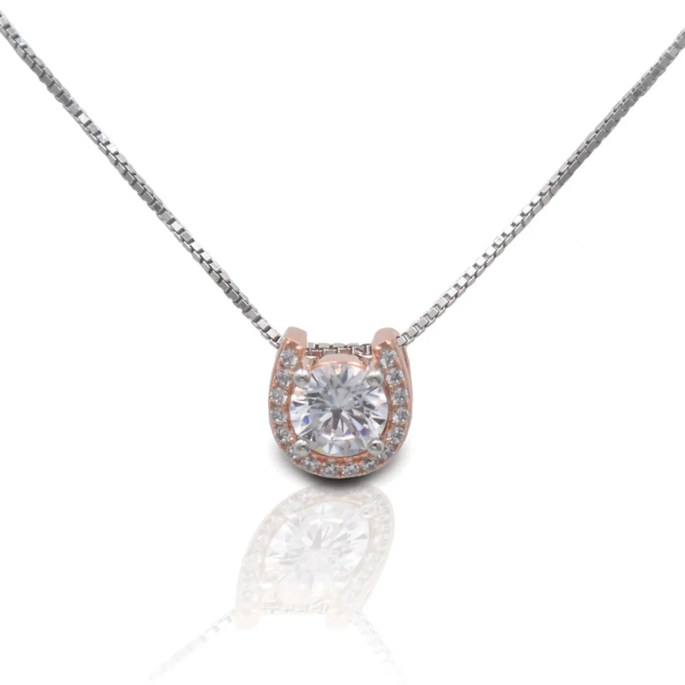 Designed with equestrians in mind! The Kelly Herd Rose Gold Plated Horseshoe Necklace was designed to compliment the best selling Kelly Herd Rose Gold Plated Horseshoe series. The center silhouette stone in this pendant is surrounded by a rose gold plated horseshoe that is enhanced with smaller clear cubic zirconia stones. Complete with an adjustable 16-18″ chain.