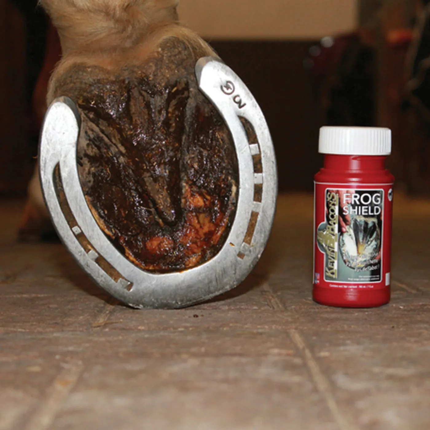 Kevin Bacon’s Frog Shield is recommended for frogs and soles that are softened, sensitive, smelly, and/or too thin. Applying Frog Shield to the sole and frog of the hoof during a shoeing renewal and before any silicone application can help maintain the health of the sole, white line and frog. Features an integrated applicator brush and adheres perfectly to the sole and frog of the hoof.