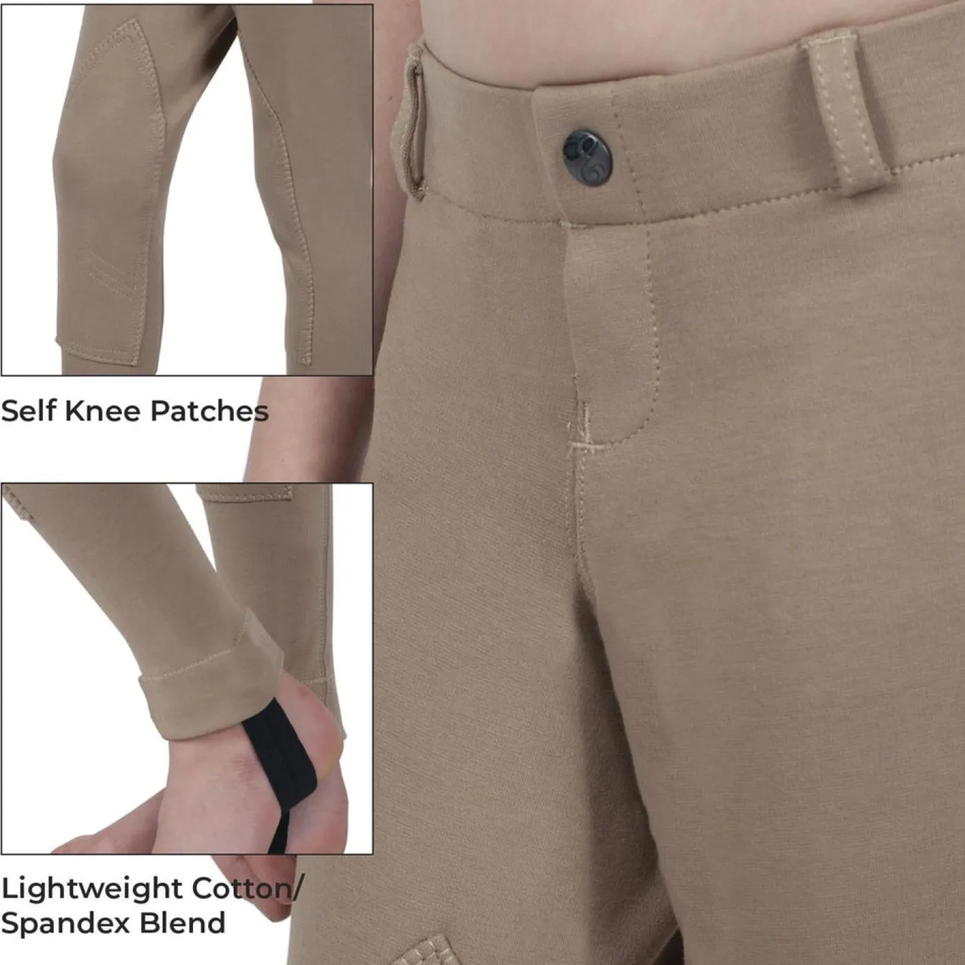 The Elation Red Label Jodhpur is a classic jodhpur for the junior competitor with its comfortable, practical and traditional style and fit. The Red Label Jodhpur features premium weight 14 ounce 95% cotton and 5% spandex, for great four-way stretch and comfort. This jodhpur feels and looks like a breech, but has all the extras expected in a true jodhpur including self knee patches, false fly, belt loops, excellent reinforced stitching, a trendy Euro seat design and elastic boot strap at the ankles (removable) with cuffed bottoms.