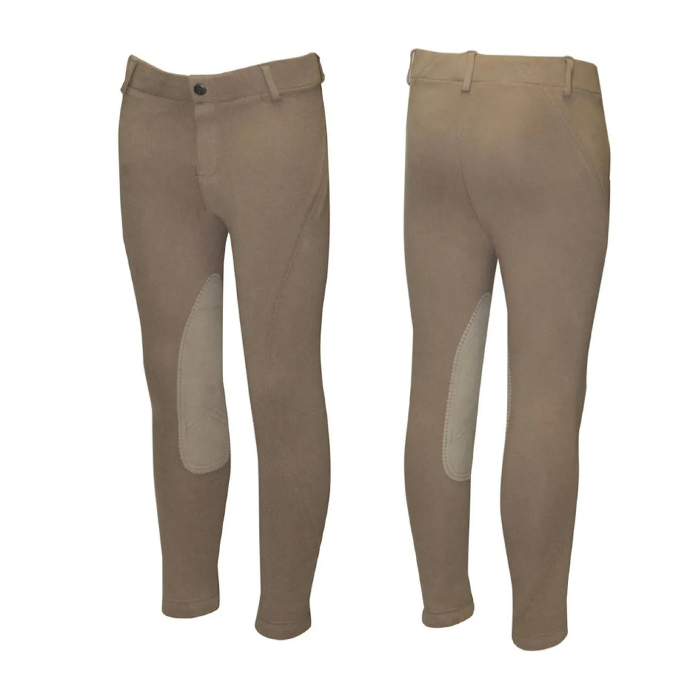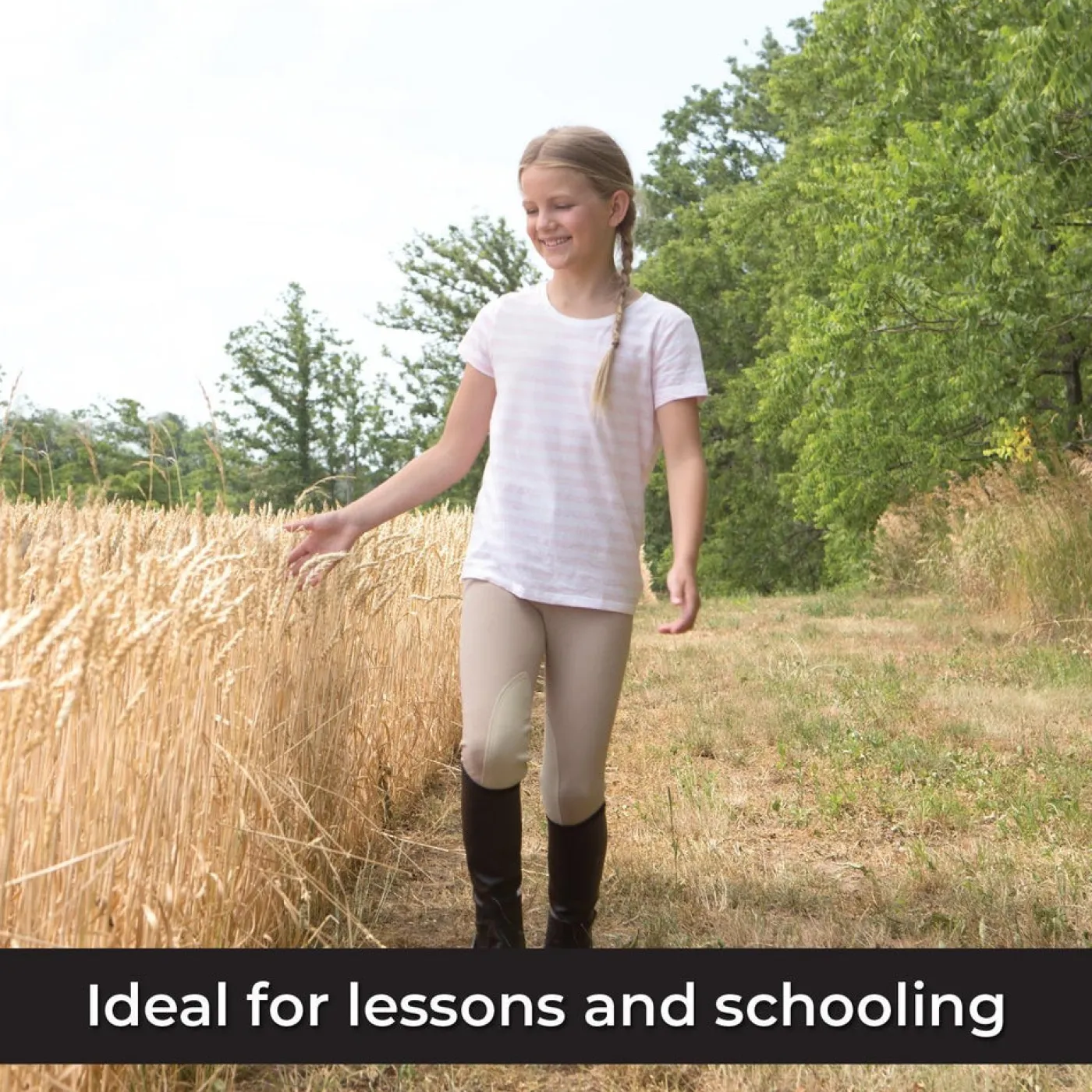 The Elation Red Label Pull On Breech is lightweight 14 ounce 95% cotton and 5% spandex constructed breech properly sized for the young equestrian. Features premium RIMA leather knee patches, elastic inner cuff at the ankles, small inside key pocket, faux fly, belt loops and reinforced stitching and finishing throughout.