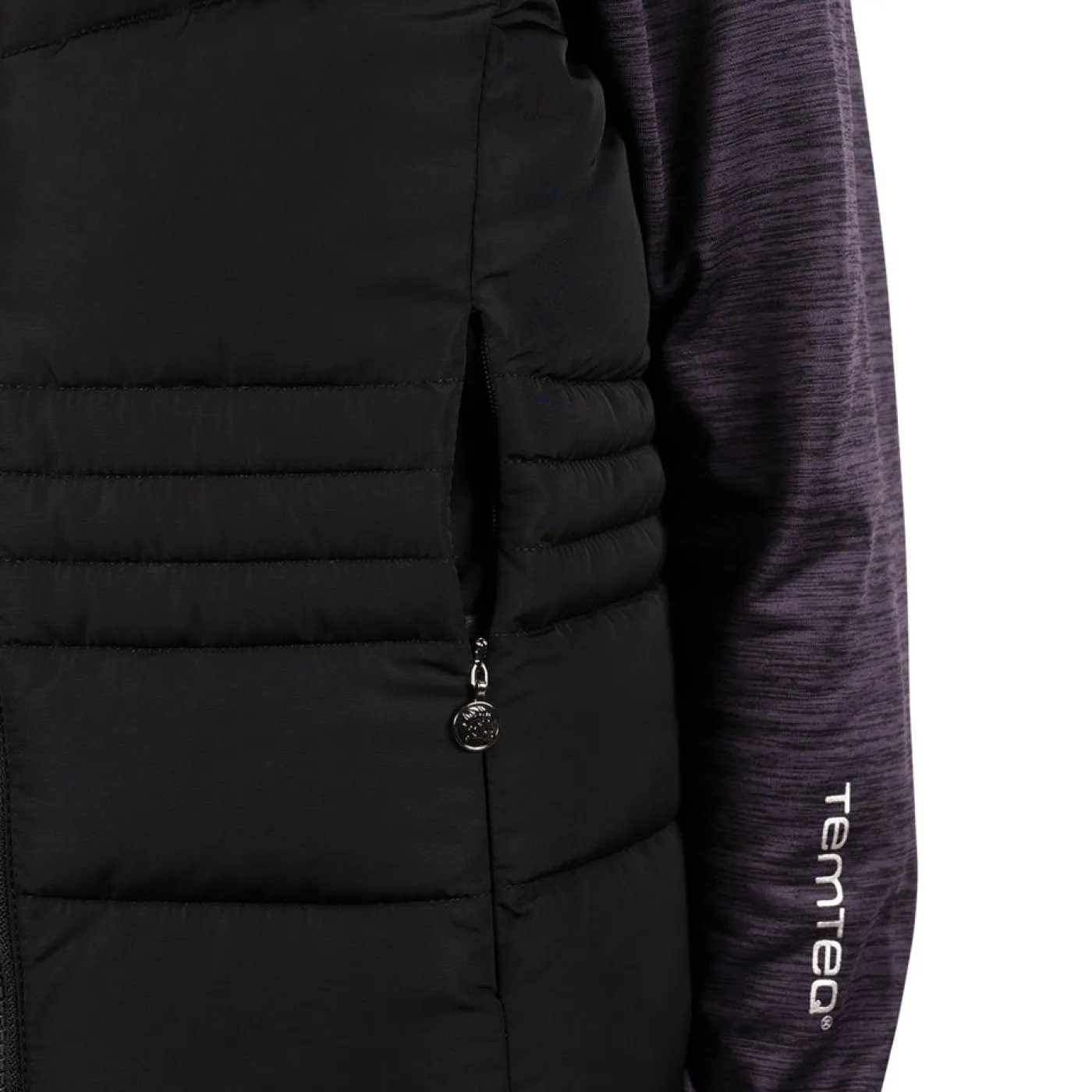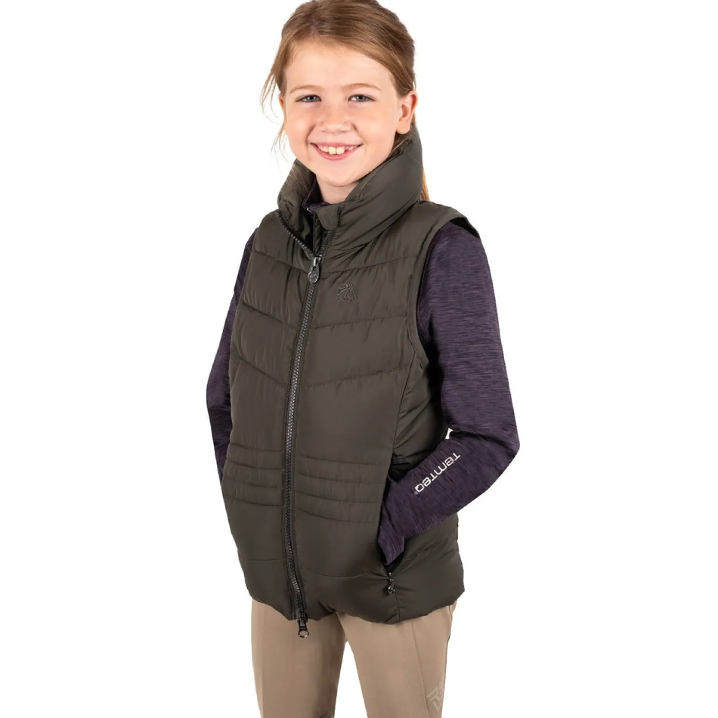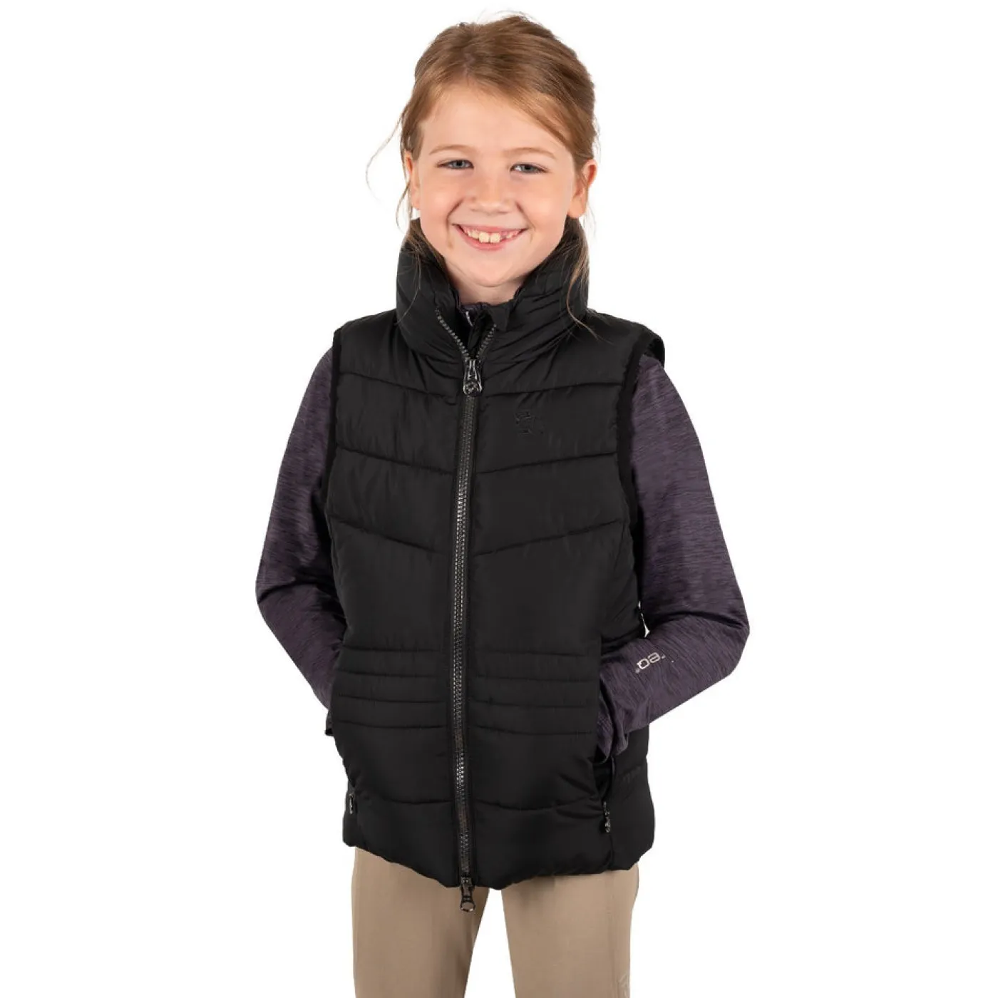 Exclusive to Greenhawk! The TemTeq Equestrian Mica Vest offers a fancy quilted vest with shaped seams to provide a form fitting appearance. Features a high collar for added coverage, welt pockets with concealed zippers, and a 2-way front zipper. Complete with embroidery at the check and a rubber badge on the back.