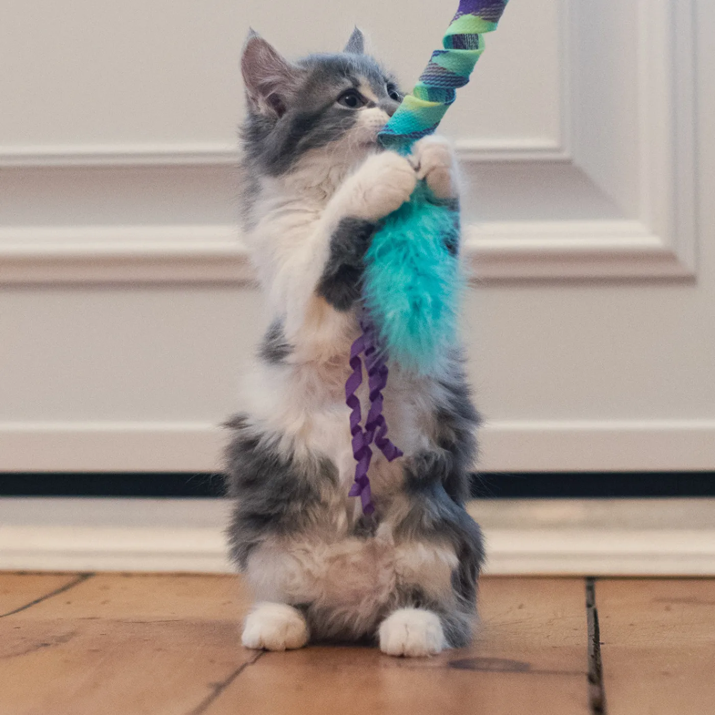 The corkscrew curl is the key to the kitty party at the end of this glittering wand. Crazy-fast recoil sealed into the durable woven spirals mean when your cat pounces onto the feather and ribbon target, they’re rewarded with more wild, high-speed springing action launching them into further fun.